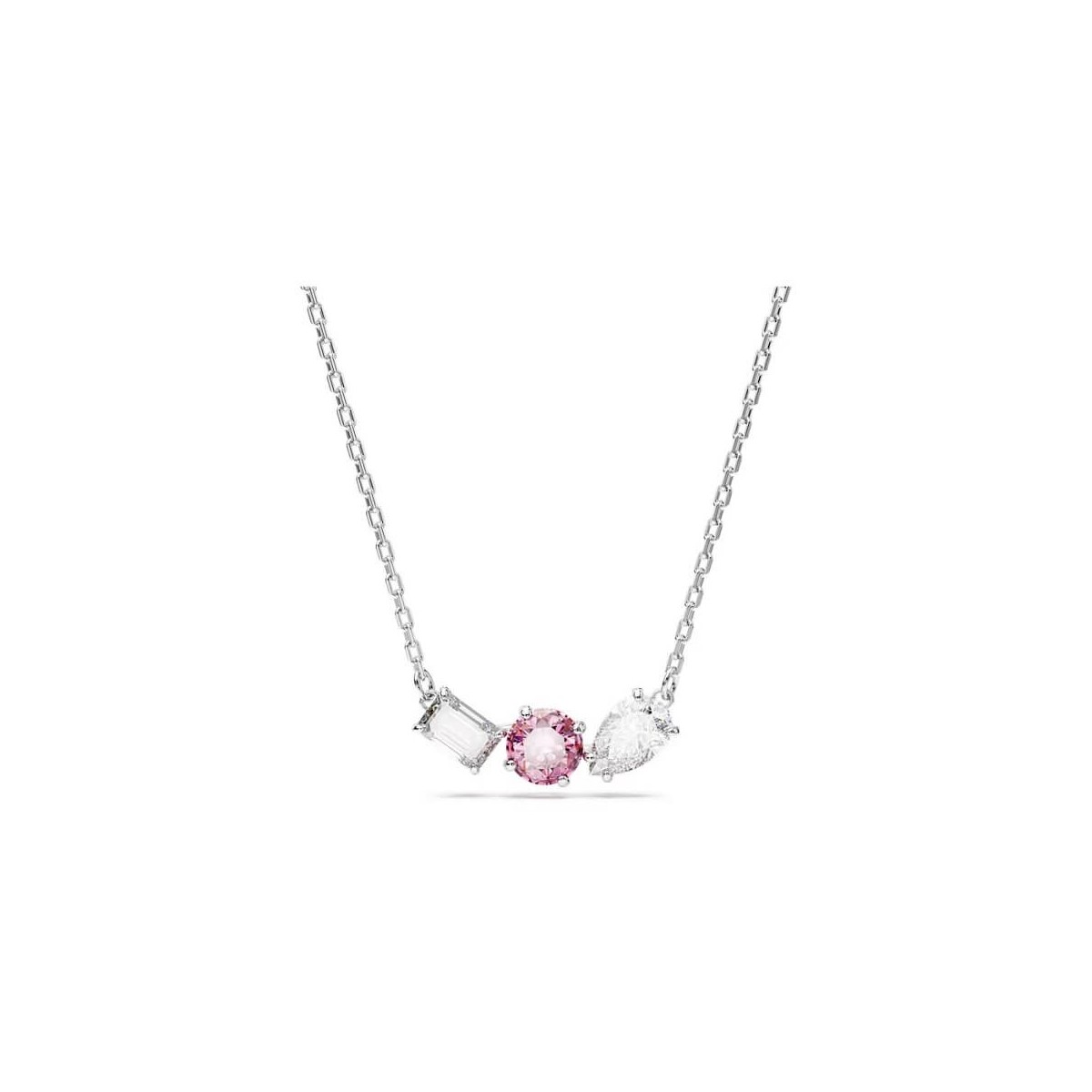 Collana da donna Swarovski, della collezione Mesmera, placcata rodio, presenta un trio di Swarovski Zirconia di diverse forme con incastonatura a griffe e una splendente pietra centrale rosa cipria. Chiusura a moschettone con allungamento.