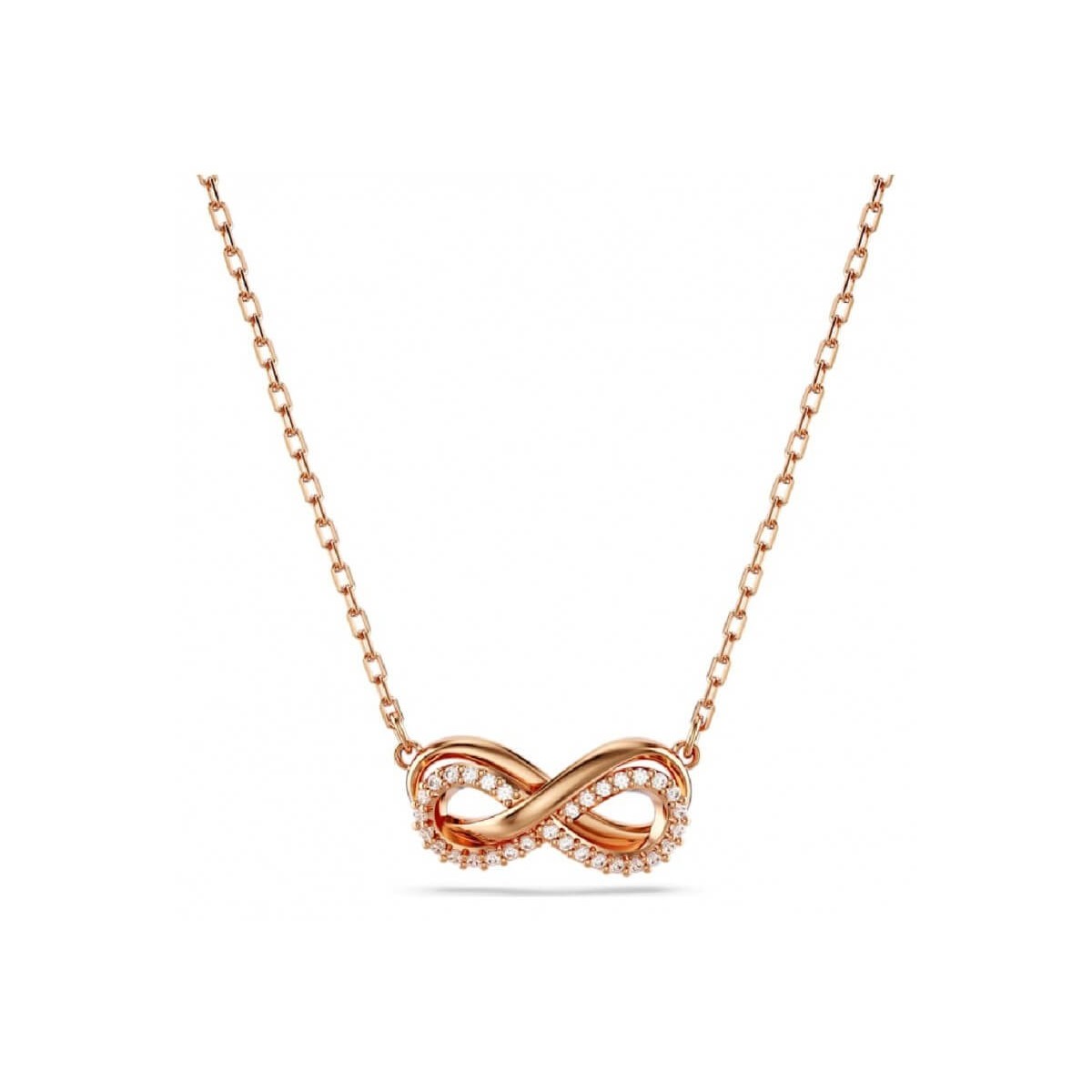 Collana girogola da donna Swarovski, della collezione Hyperbola, realizzato con catena placcata color oro rosa. Il gioiello presenta una catena sottile ed elegante con pendente simbolo infinito impreziosito da un pavè di Crystal Clear.