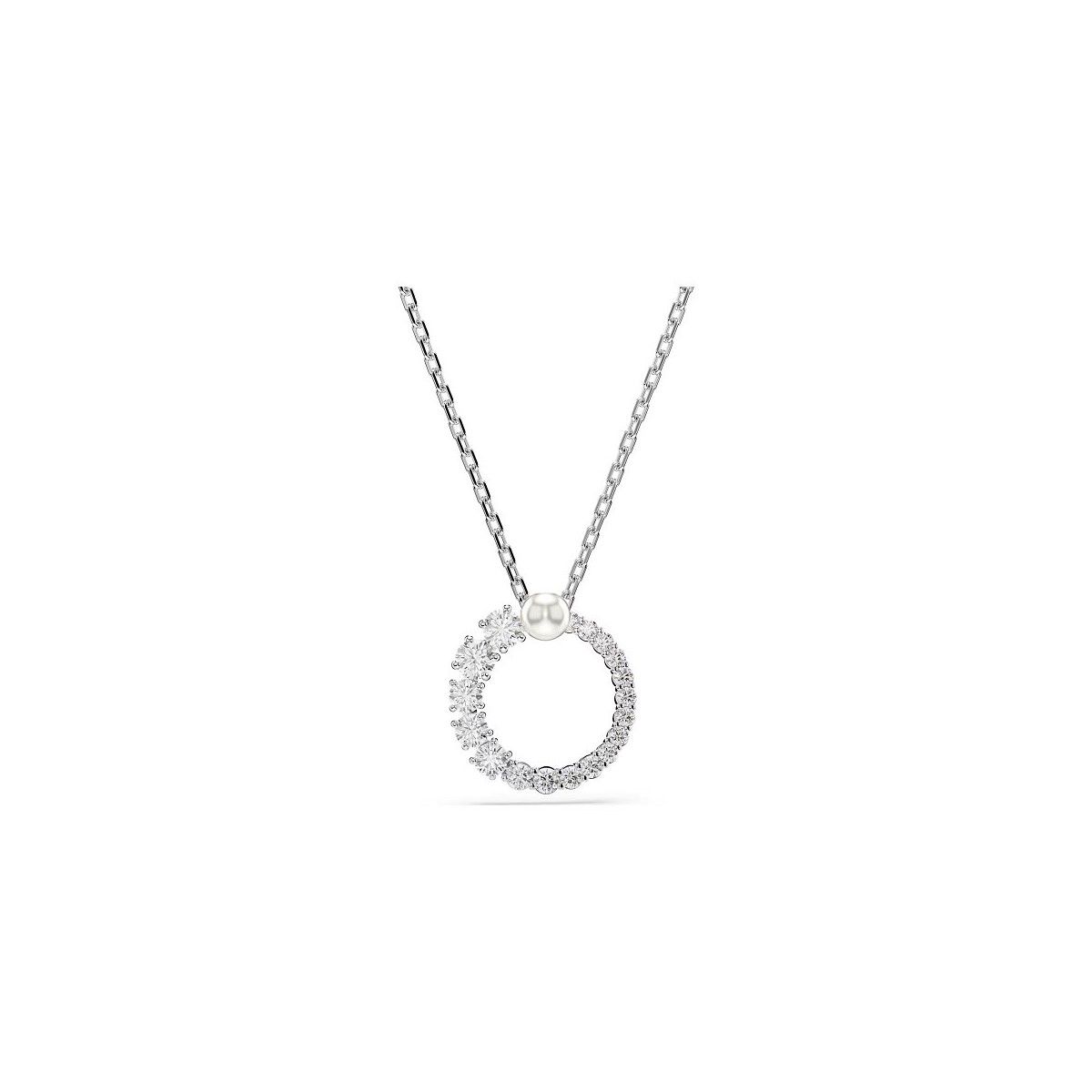 Collana pendente, della collezione Matrix, da donna Swarovski, esaltano l'interazione tra geometria e luce. La collana è realizzata con placcatura rodio. Presenta un pendente ad anello di Swarovski Zirconia trasparenti, di varie misure, ed è terminato con Crystal Pearl bianca al centro.