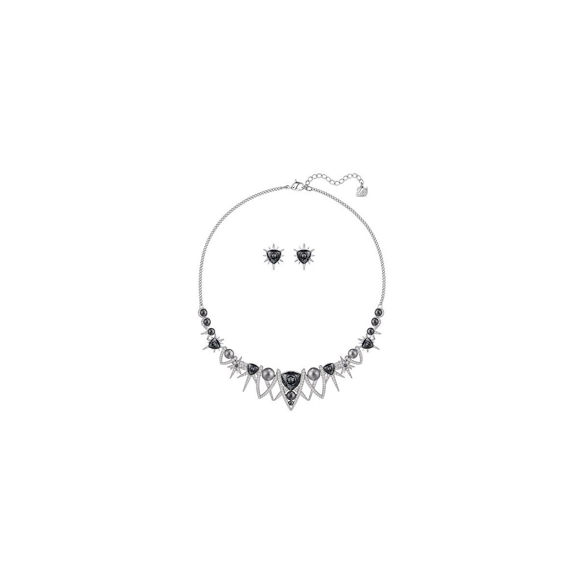 Ecco un gioiello dallo spirito rock che guarda alle stelle. L’ispirazione siderale di questa parure rodiata è interpretata in una raffinata palette cromatica che alterna Clear Crystal e Crystal Pearl grigie. Il set comprende un girocollo e un paio di orecchini a buco. La collana misura 38 cm e gli orecchini 1,5 cm.
