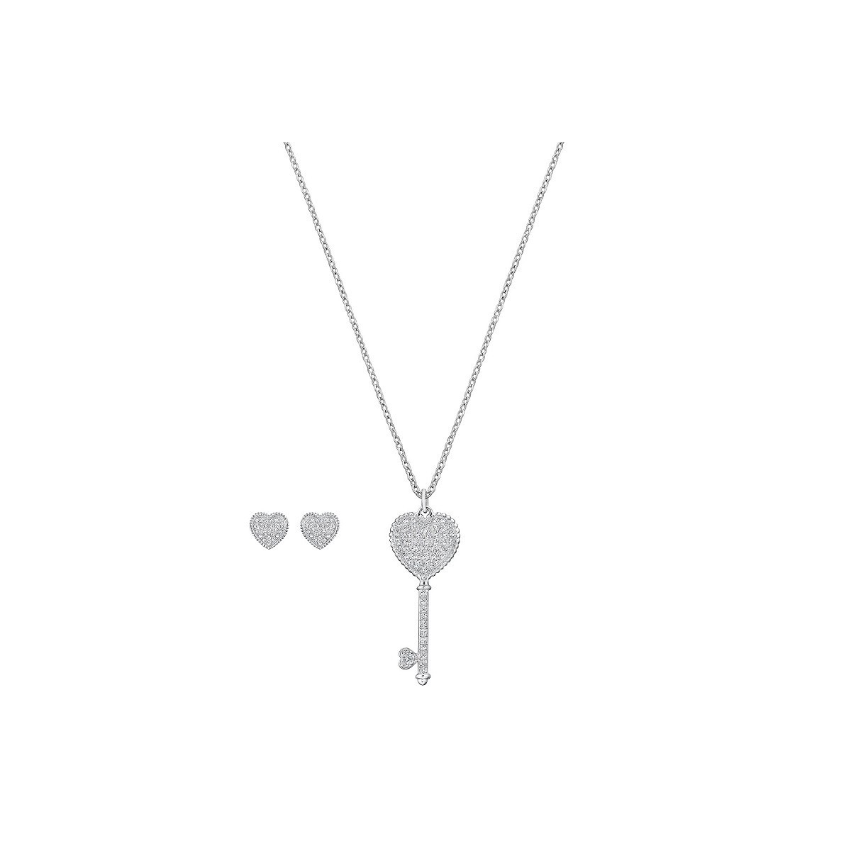 Set gioielli collana in metallo rodiata chiave pendente con orecchini lobo forma cuore in pavè di cristalli bianchi