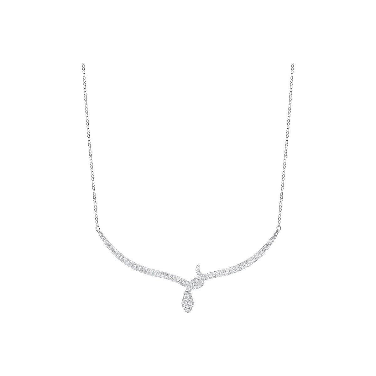 Collana donna modello colier con motivo serpente e pavè di cristalli bianchi montata su allunganmento a catena sottile rodiata e chiusura a moschettone; lunghezza regolabile