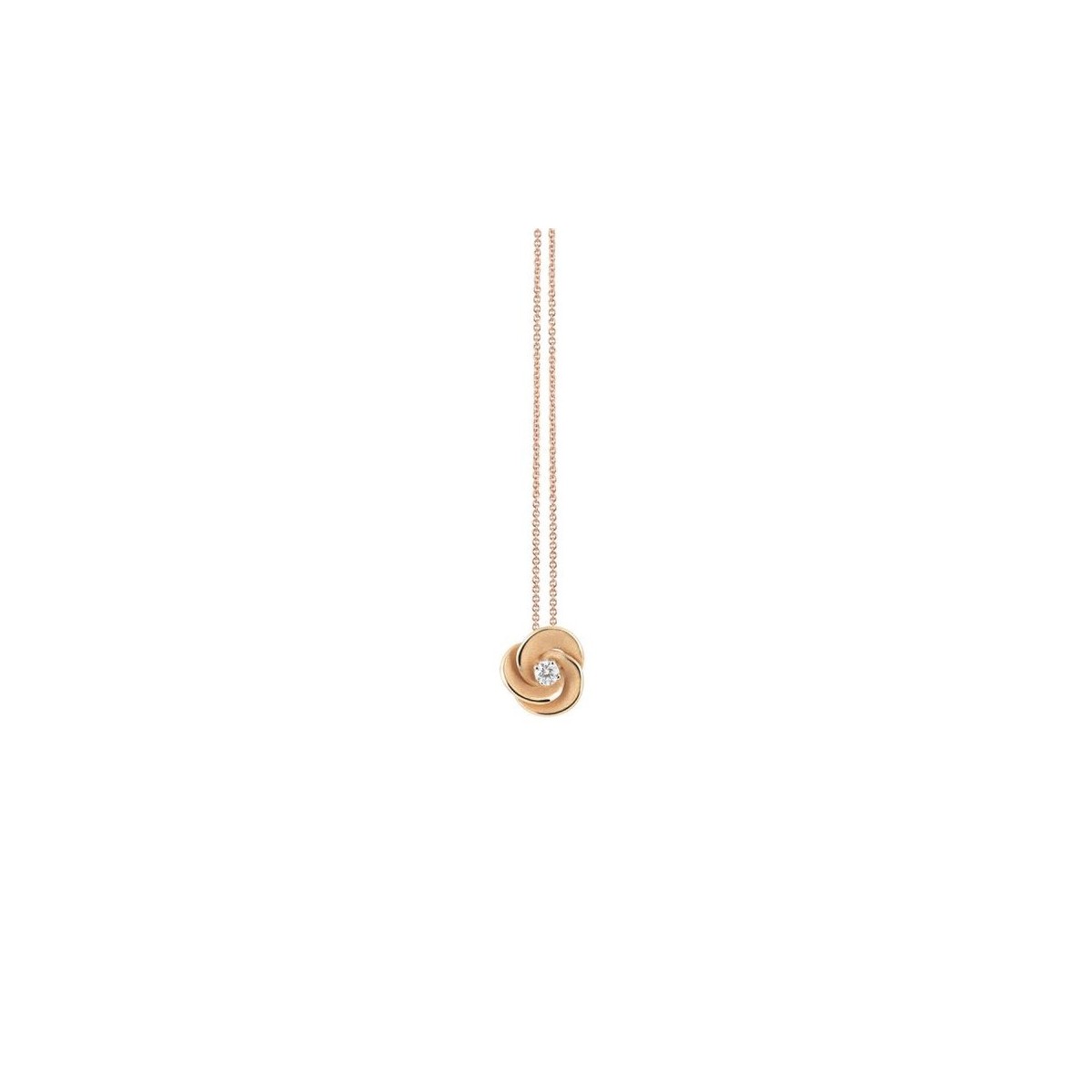 Collana girogola da donna Annamaria Cammilli, della collezione Desert Rose, realizzata in oro arancio albicocca 18 kt e pendente che rappresenta un fiore, fiore del deserto appunto, con finiture lisce ed omogenee dai bordi lucidi ed interni satinati, impreziosito da un diamante naturale centrale taglio brillante di 0,06 carati.
