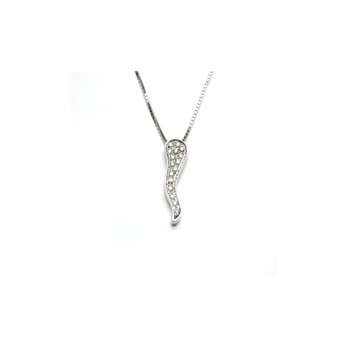 Collana donna Salvini, della collezione Pegaso, realizzata in oro bianco 18 carati e pendente composto da un corno portafortuna impreziosito da pavè di diamanti naturali taglio brillante di 0,14 carati totali.