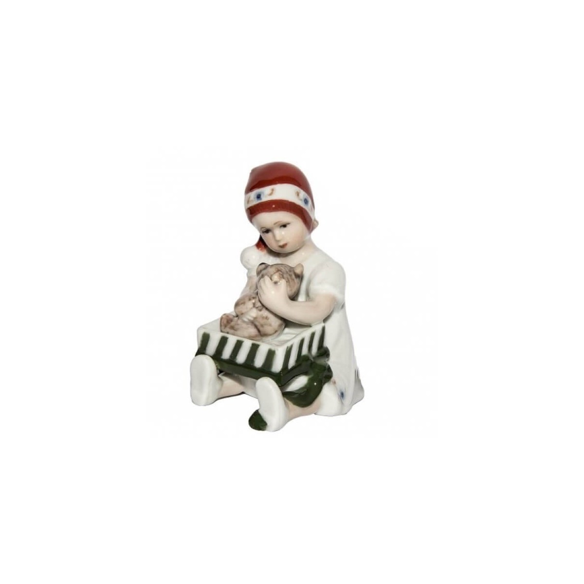 Royal Copenhagen, statuina natale, figura bambina vestito bianco con pacco regalo ed orsetto, in porcellana colorata.