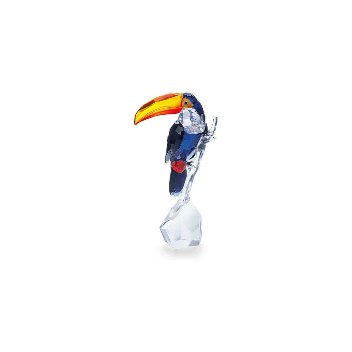 Tucano Swarovski, della collezione Crystal Paradise, realizzato con gradazione di cristalli rossi, arancioni, scuri e bianchi Clear Crystal che creano una meravigliosa sinfonia di colori, appollaiato su un ramo anch'esso di cristalli.