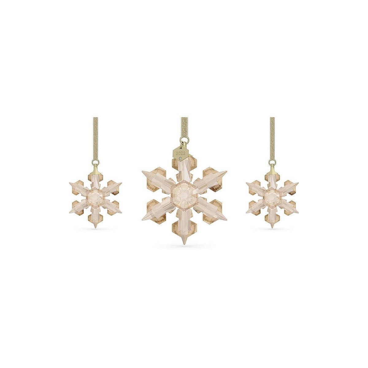 L'edizione annuale 2022 di Swarovski festeggia il suo quarto decennio con questo elegantissimo set composto da un raffinato fiocco di neve più grande realizzato sapientemente in cristal cry di colore oro champagne con più di 170 sfaccettature, base in metallo della stessa tonalità e nastro in lamè dorato. Il set include anche due versioni più piccole dello stesso design.