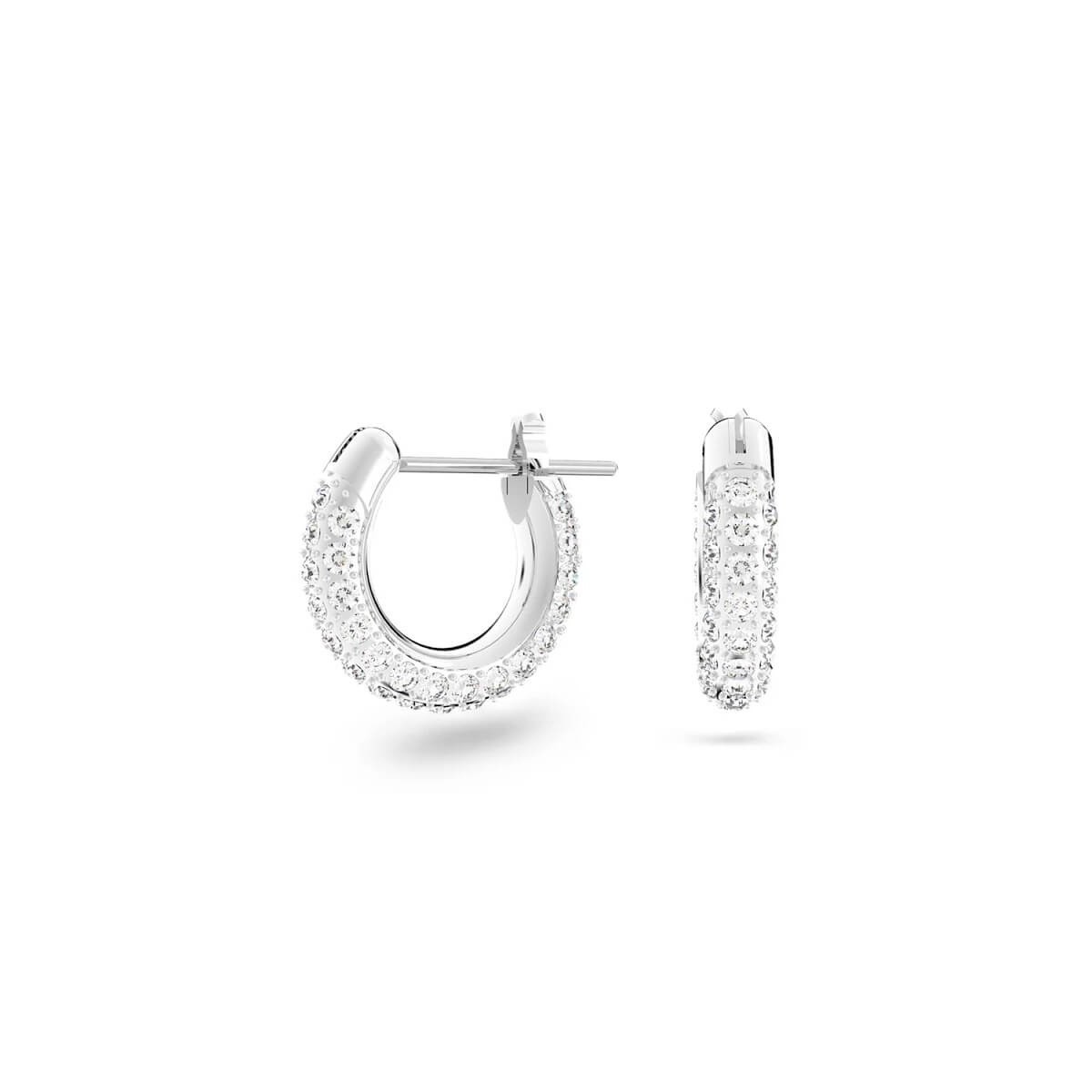 Orecchini piccoli a cerchio Swarovski della collezione Stone realizzati in metallo rodiato con pavè di cristalli bianchi che donano lucentezza al viso di chi li indossa.