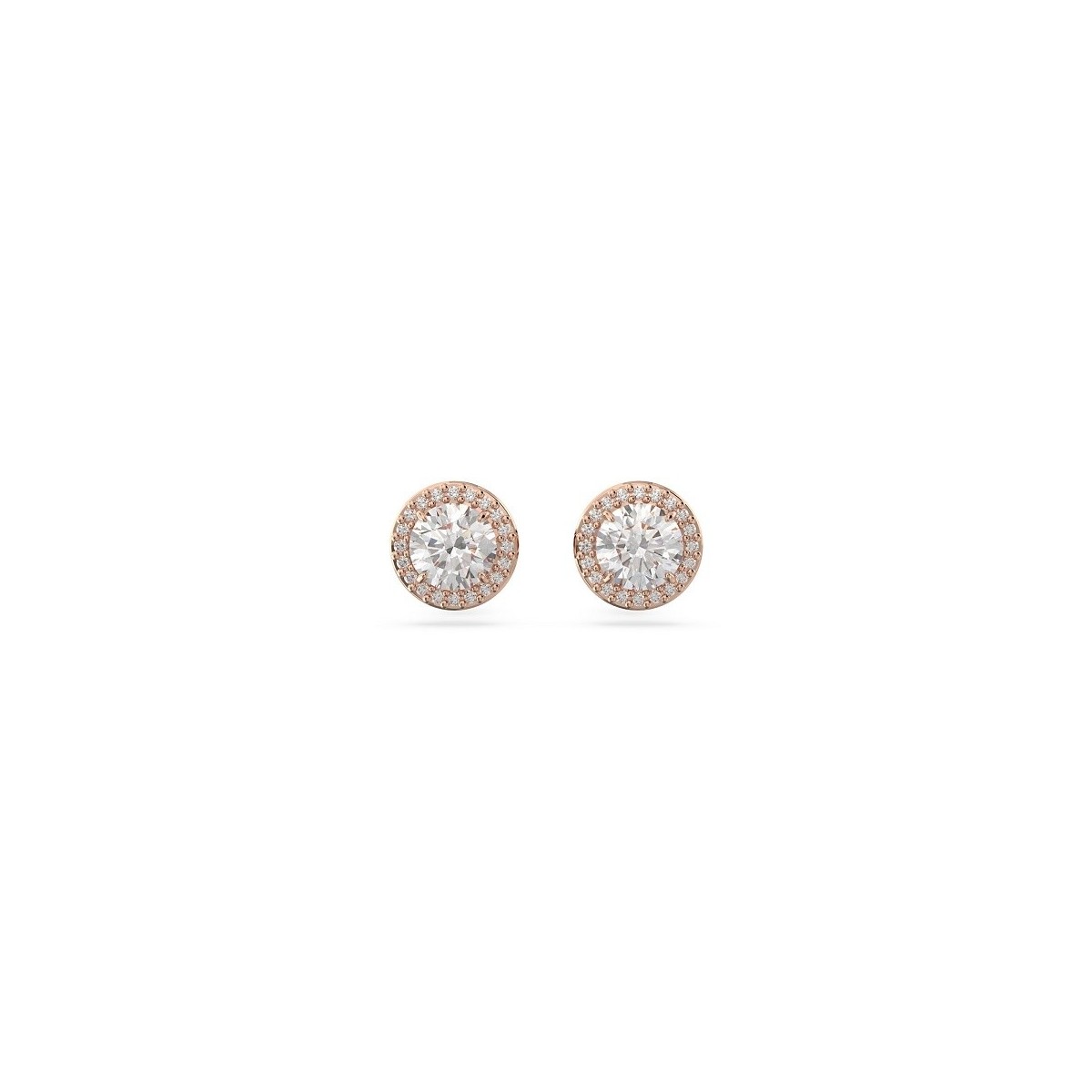 Orecchini da donna, modello a lobo, Swarovski della collezione Constella. Questo paio di orecchini, esibisce pietre trasparenti illuminate dalla squisita tecnica pavé Swarovski, rifinito da una montatura placcata color oro rosa.