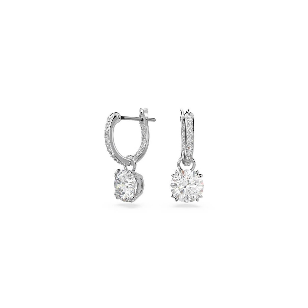 Orecchini da donna, modello a lobo, Swarovski della collezione Constella. Le sfavillanti pietre centrali sono valorizzate dal pavé, sulla galleria e sui cerchi, incastonati in una placcatura rodio.