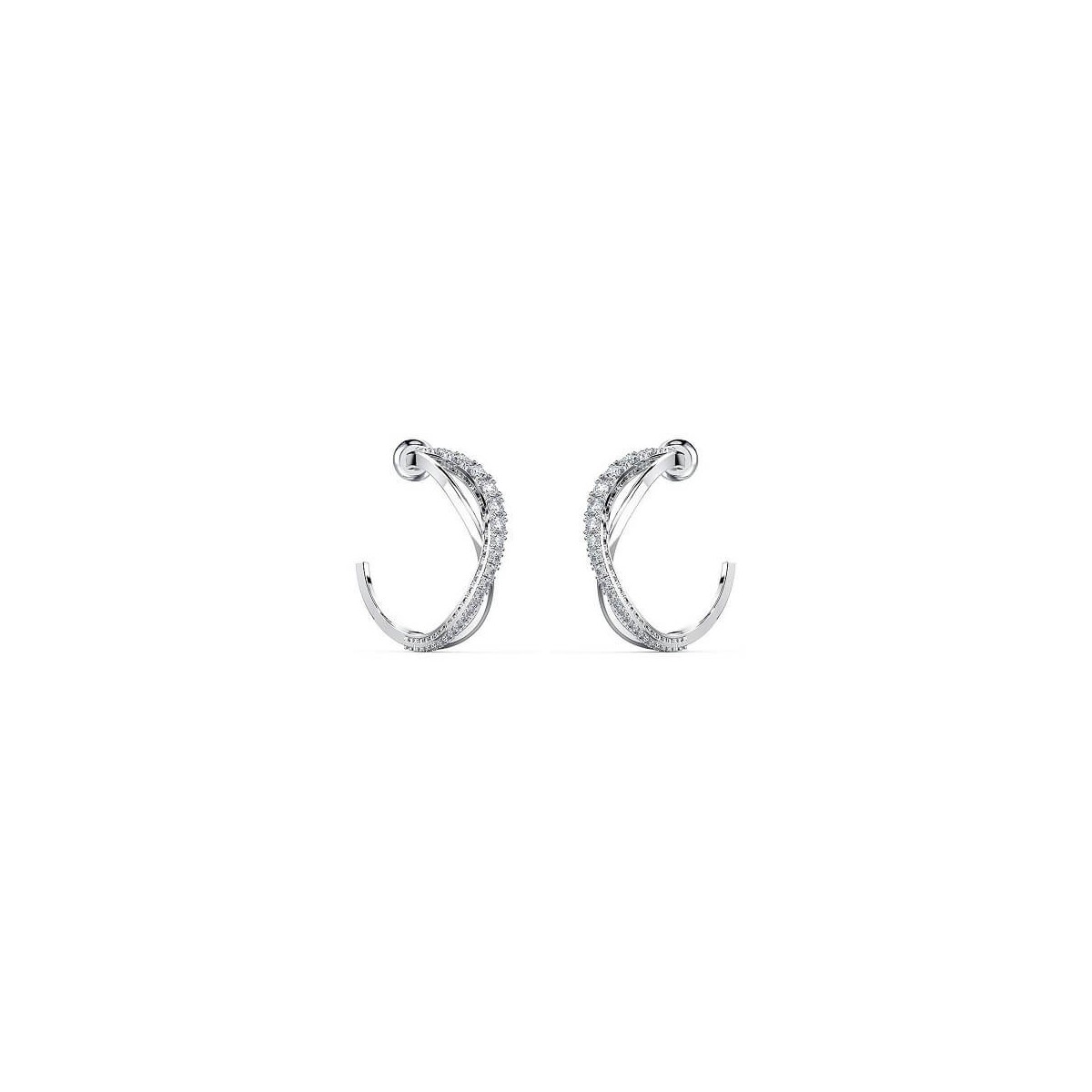 Orecchini a cerchio Swarovski, della collezione Twist, placcato in rodio. Entrambi gli orecchini sono realizzati in due linee dalle curve eleganti, intrecciate tra loro, una dalla luncente brillantezza delle pietre bianche luccicanti, l'altra dal delicato scintillio. Chiusura a farfallina.