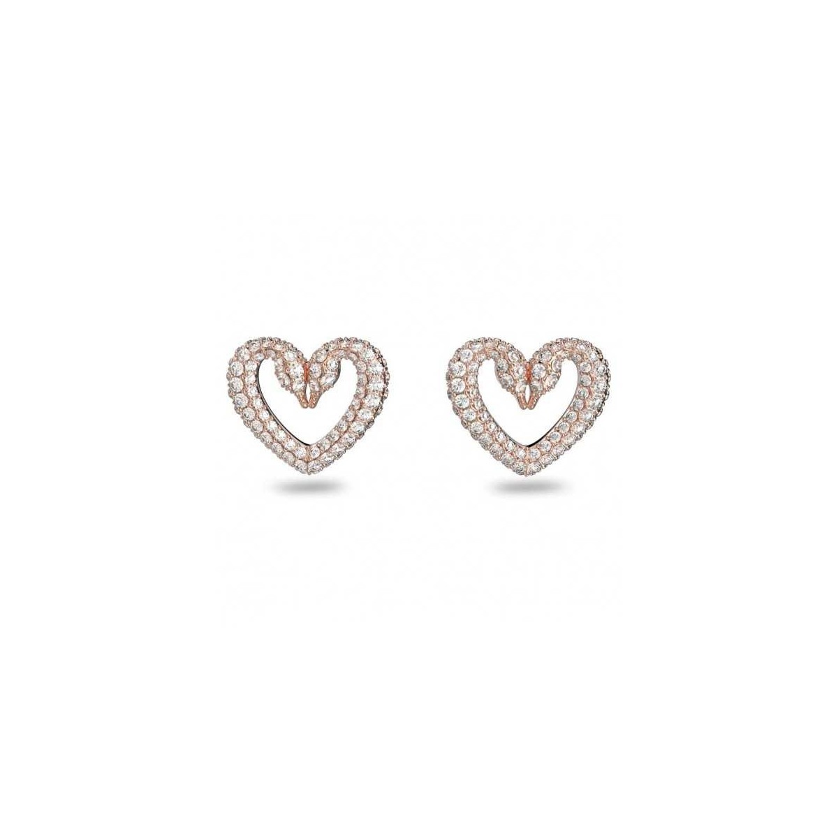 Orecchini Swarovski, della collezione Una, con l'iconico cigno a forma di cuore, simbolo di amore eterno, realizzato con pavé in cristallo incastonati su placcatura oro rosa. Chiusura a farfallina.