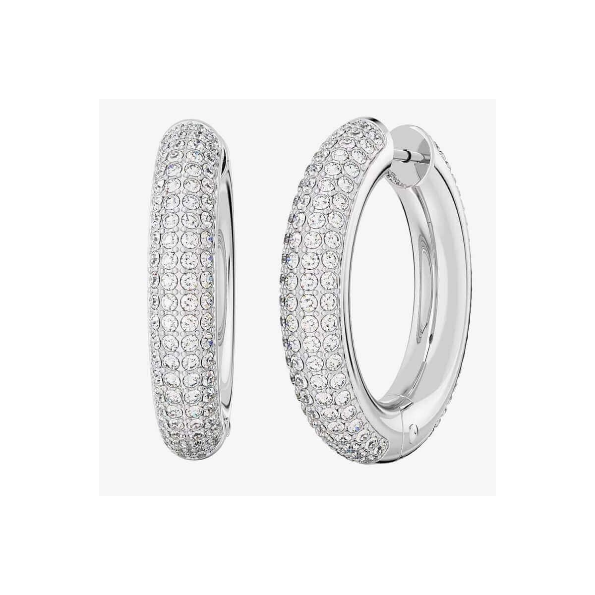 Orecchini a cerchio donna Swarovski, della collezione Dextera, realizzati in metallo rodiato con pavè di cristalli bianchi all-over che donano lucentezza al viso di chi li indossa.