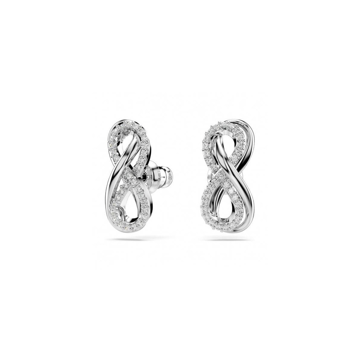 Orecchini a lobo da donna Swarovski, della collezione Hyperbola, realizzati con placcatura rodio e simbolo infinito impreziosito da un pavè di Crystal Clear.