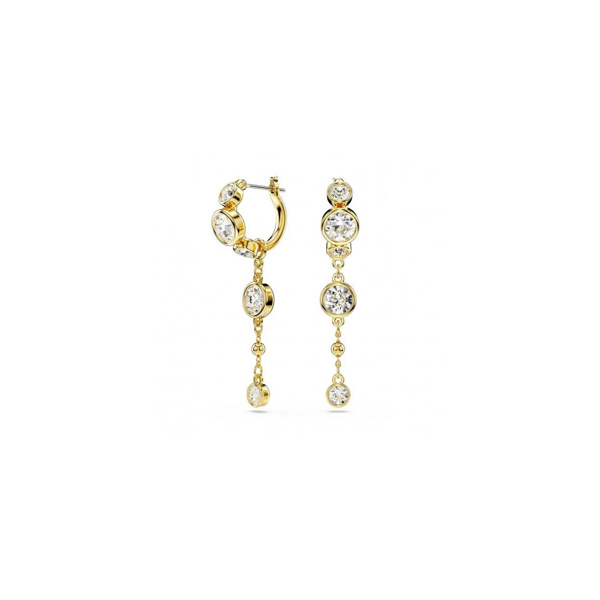 Orecchini pendenti femminili Swarovski, della collezione Imber, realizzati con placcatura color oro giallo. Ciascun orecchino è composto da un piccolo cerchio con catenina pendente, rimovibile, impreziosita da gocce di metallo dorato e cristalli taglio tondo incastonati su montatura bombata . Chiusura a baionetta.