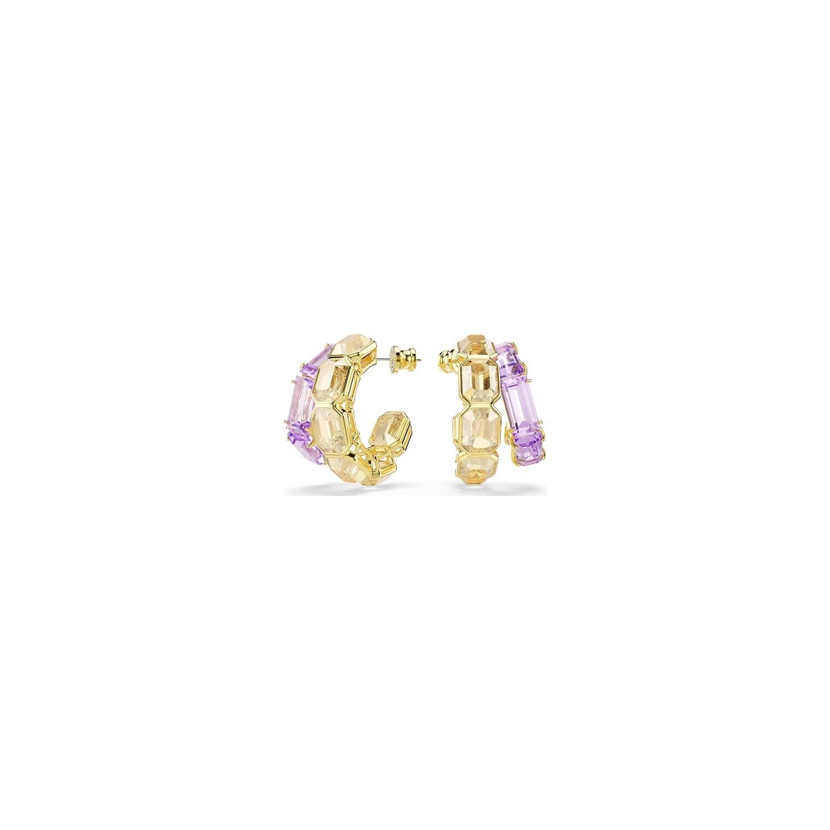 Orecchini firmati Swarovski appartenenti alla collezione Millenia. Gli orecchini sono realizzati con placcatura color oro, presenta due mini cerchi asimetrici, con cristalli color cammello ottagonali in una montatura a castone e cristalli viola in una montatura a griffe.