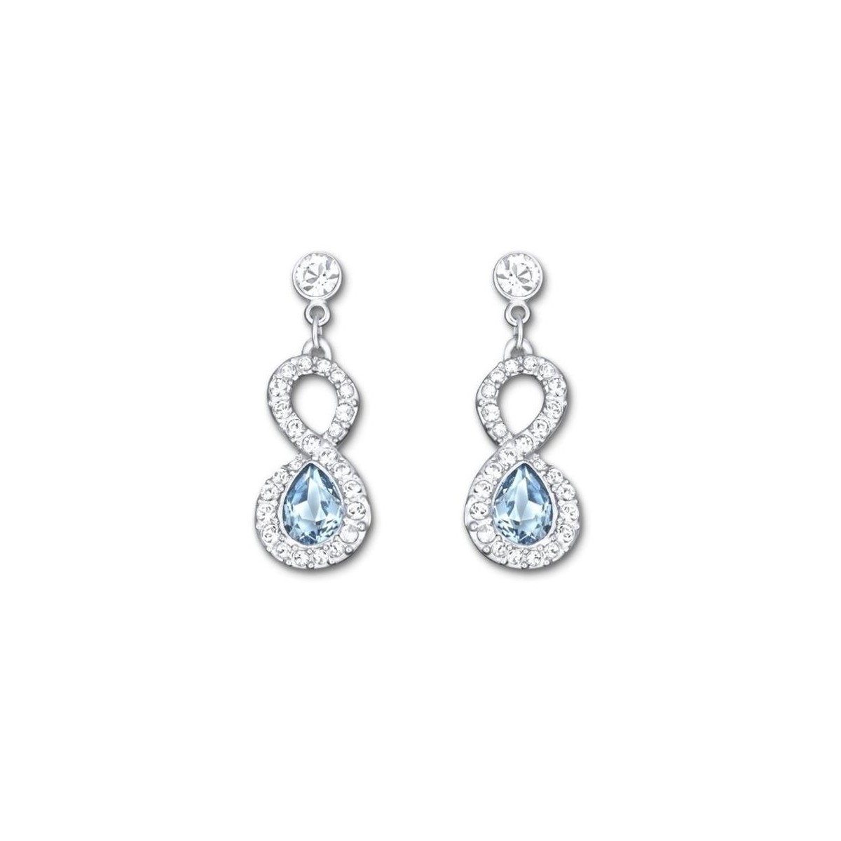 Gli eleganti orecchini rodiati riprendono la forma a “8”, numero portafortuna nella tradizione cinese. Il cristallo Aquamarine “pear-shaped” è incorniciato da un brillante profilo in pavé in Clear Crystal.