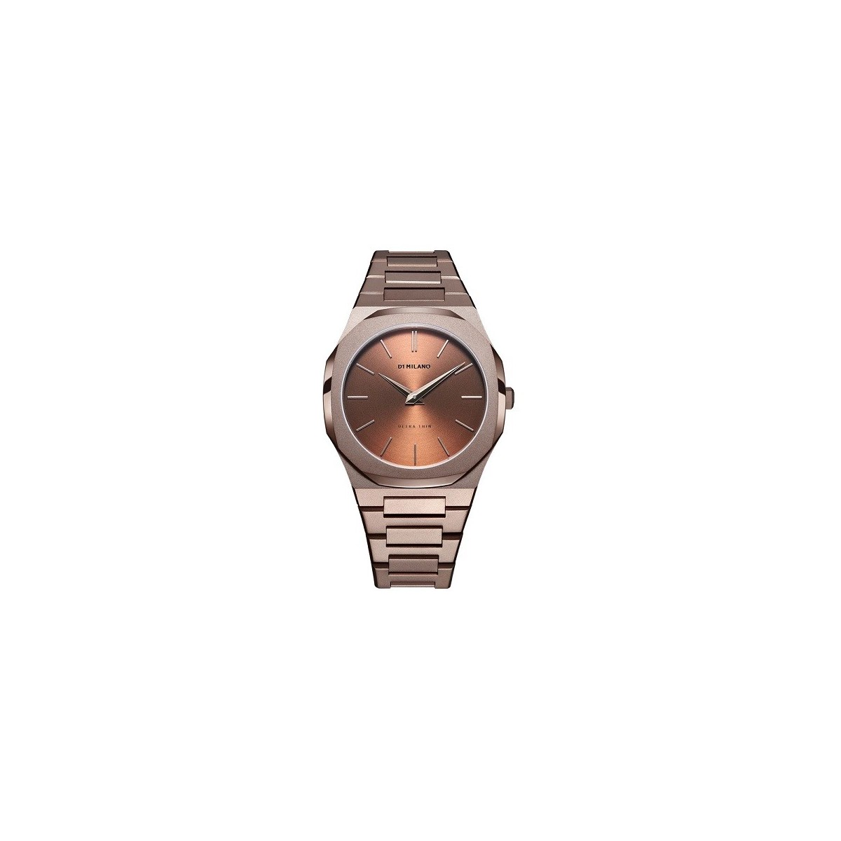 Orologio unisex D1 Milano, della collezione Ultra Thin, con funzione di solo tempo al quarzo con movimento Citizen Miyota 1L22. L'orologio è realizzato con cassa ottagonale in acciaio inox satinato finitura pvd marrone di diametro 40 mm. Quadrante tondo marrone sunray con indici della stessa tonalità. Ghiera in acciaio inox pvd marrone. Vetro zaffiro con anti-riflesso. Chiusura a doppio depoyante.