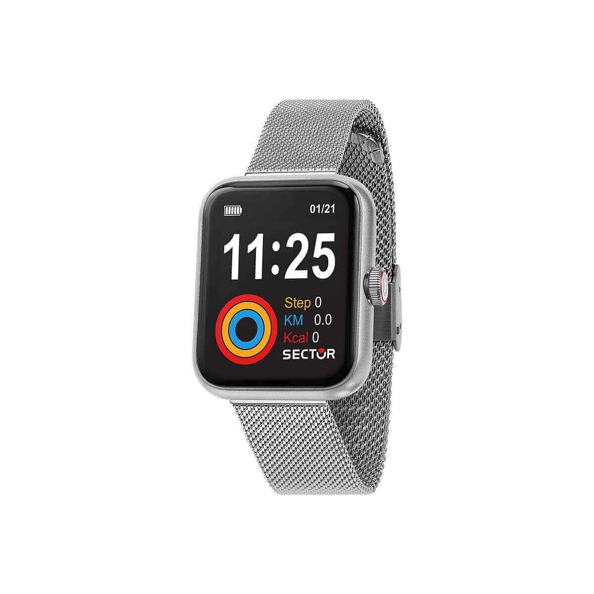 Orologio Smartwatch Unisex Sector, della collezione S-03, realizzato con bracciale a maglia milanese in acciaio, cassa rettangolare di 46,5 mm e quadrante a colori con modalità touchscreen. Movimento digitale con connessione Bluetooth per collegarlo al cellulare. Chiusura con clip e gancio. Compatibile a partire da android 6 e Ios 10