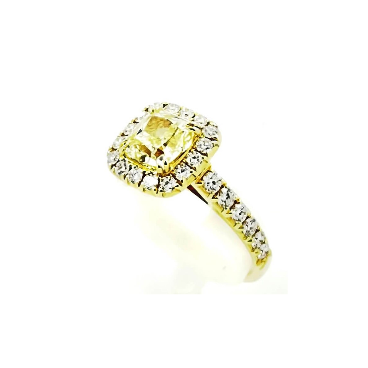 Anello stile solitario in oro giallo18kt con diamante naturale centrale fancy yellow taglio cuscino e contorno di diamanti naturali taglio brillante.