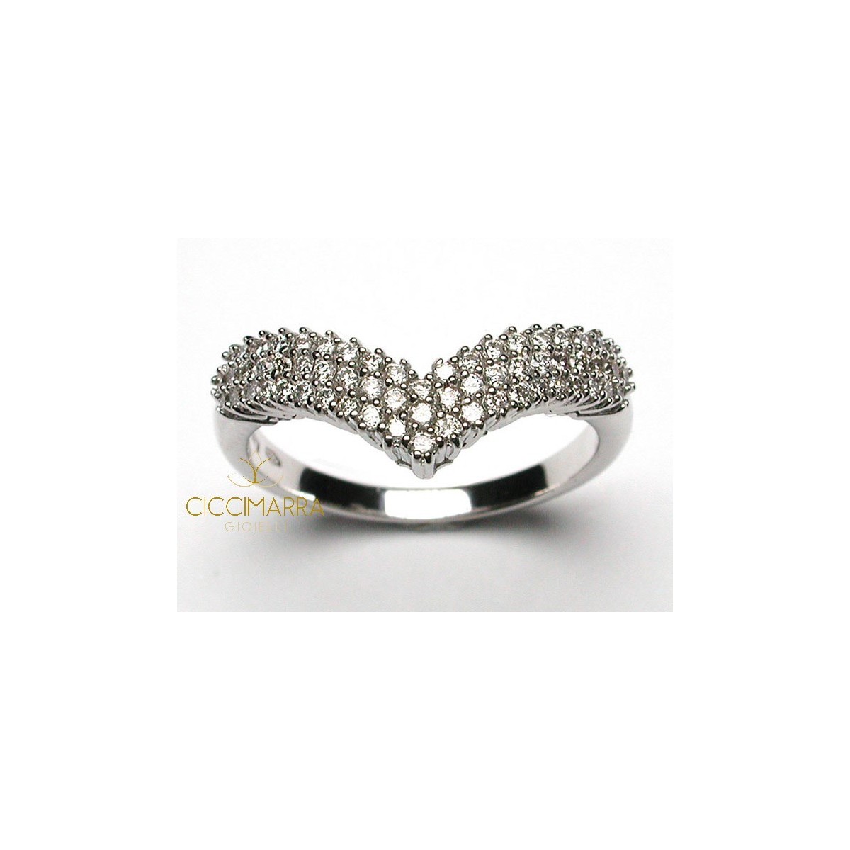 Anello in oro bianco 750/1000 con parte posteriore liscia e parte anteriore a forma di ala ricoperta da diamanti naturali taglio brillante.