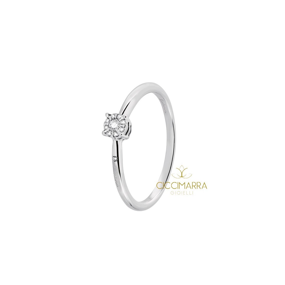 Anello in oro bianco 750/1000 composto da un diamante centrale naturale taglio brillante circondato da 8 diamantini più piccoli e un ultimo diamantino incastonato sulla base.