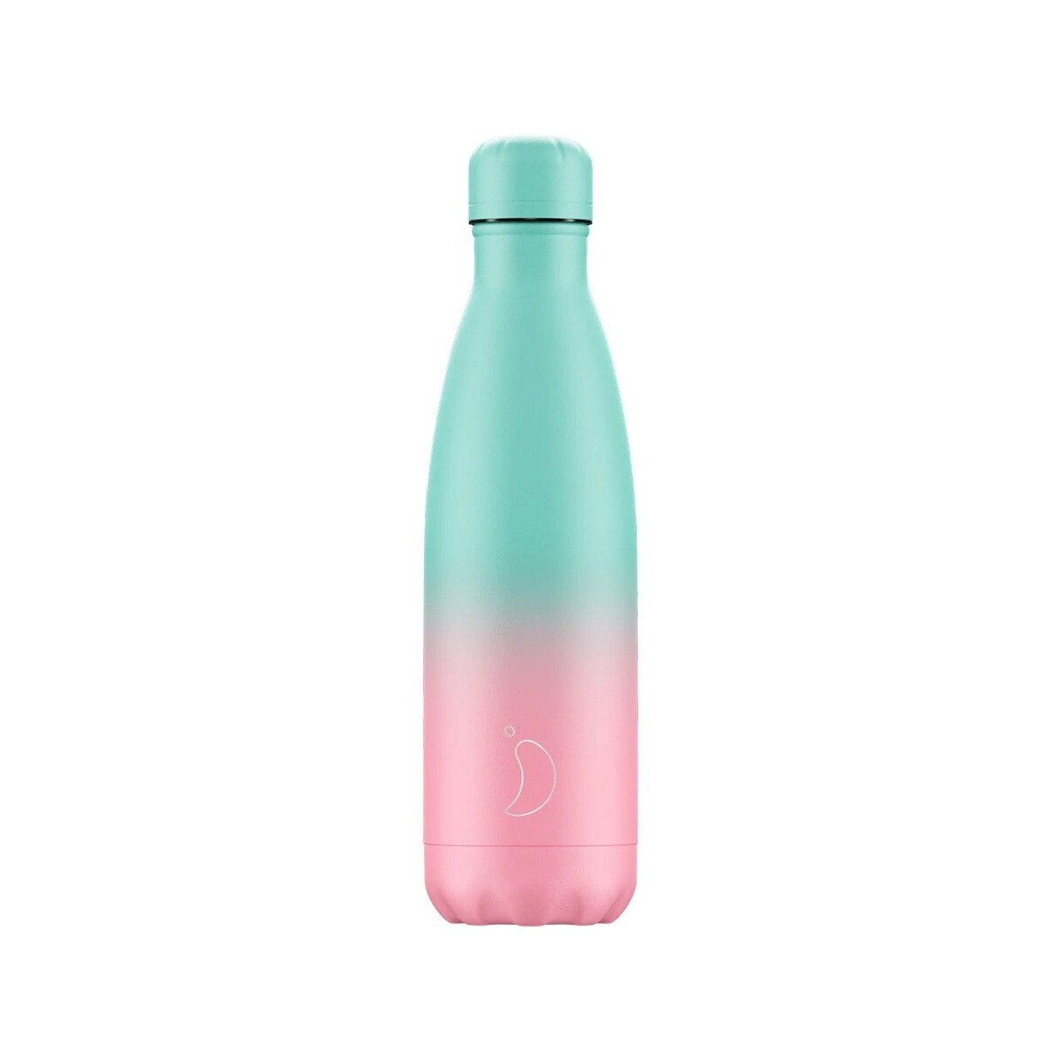 Bottiglia termica riutilizzabile della collezione Gradient dai colori sfumati dal rosa sulla base al celeste in punta e tappo avvitabile celeste, capienza 500ml, finitura opaca.