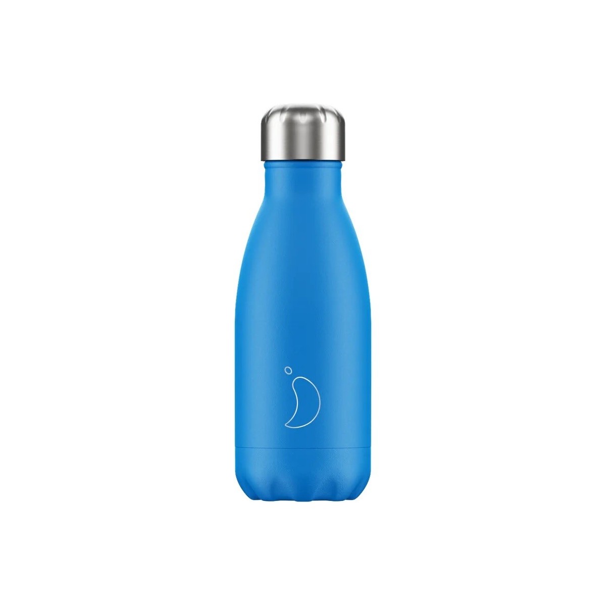 Bottiglia termica riutilizzabile della collezione Neon di colore blu elettrico e tappo avvitabile argentato, capienza 260ml, finitura fluo.