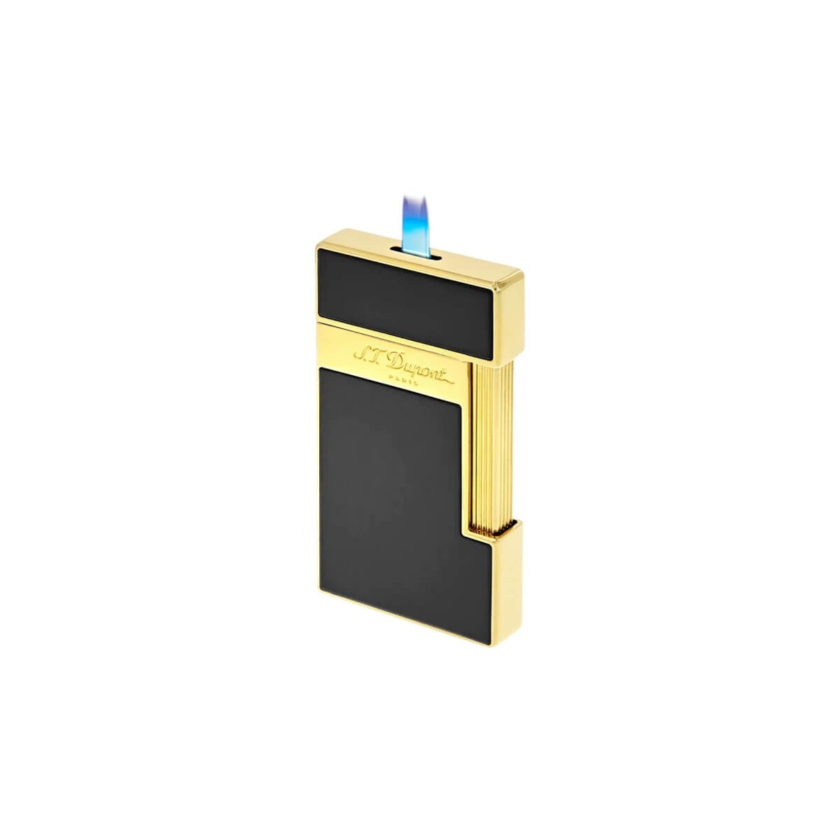Accendino S.T. Dupont della collezione Slim 7 realizzato in metallo laccato nero ed elegante finitura in pvd oro giallo lucido.