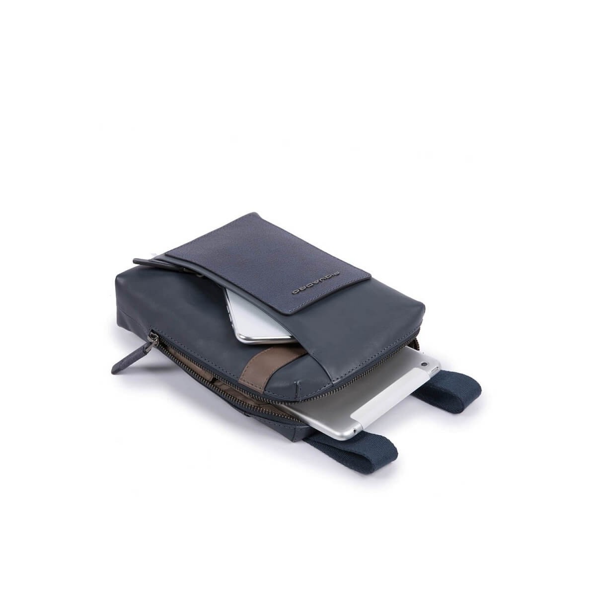 Borsello uomo in pelle della collezione Vanguard di colore blu con porta Ipad. Vanguard è la massima espressione dello stile glamour Piquadro, con l'accostamento di pellami dalla grana differente,di vitello e di bufalo, i contrasti di colore, e l'attenzione ai dettagli con finitura in canna di fulice opaca, questa collezione è tra le più ricercate e di tendenza.