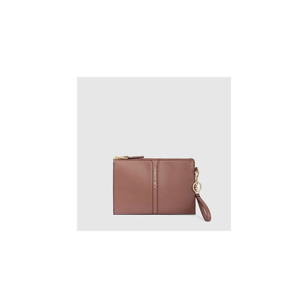 Pochette da donna da polso Piquadro della collezione Ray realizzato in pelle con grana leggera e irregolare, morbida. Accessori in metallo dorato. Chiusura a cerniera, manico a mano removibile. Tasca porta iPad con protezione anti frode RFID e manico removibile.