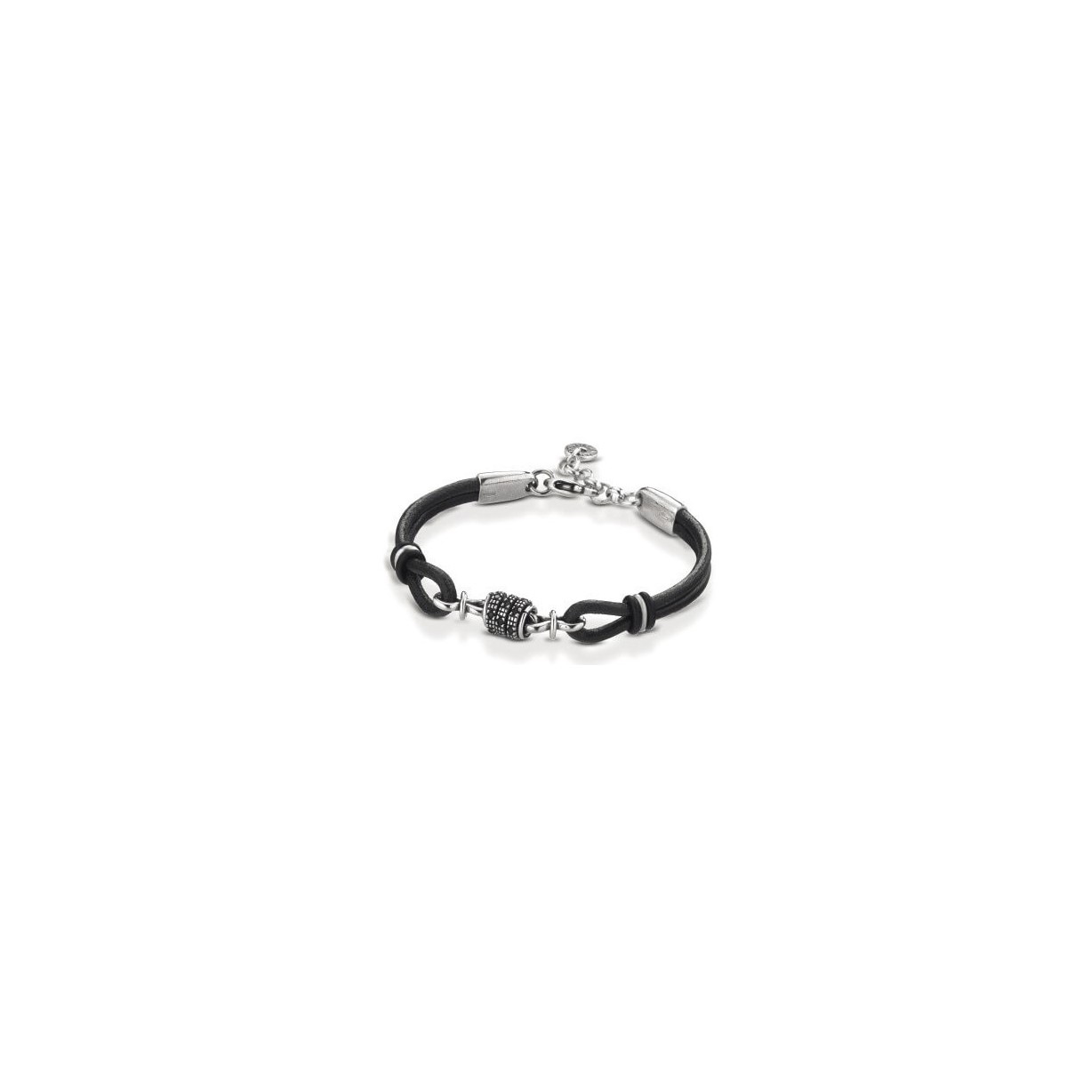 Bracciale da uomo Ananda realizzato in corda di colore nero al cui centro troviamo dei piccoli anelli impreziositi da spinelli neri, Chiusura con moschettone in argento 925.