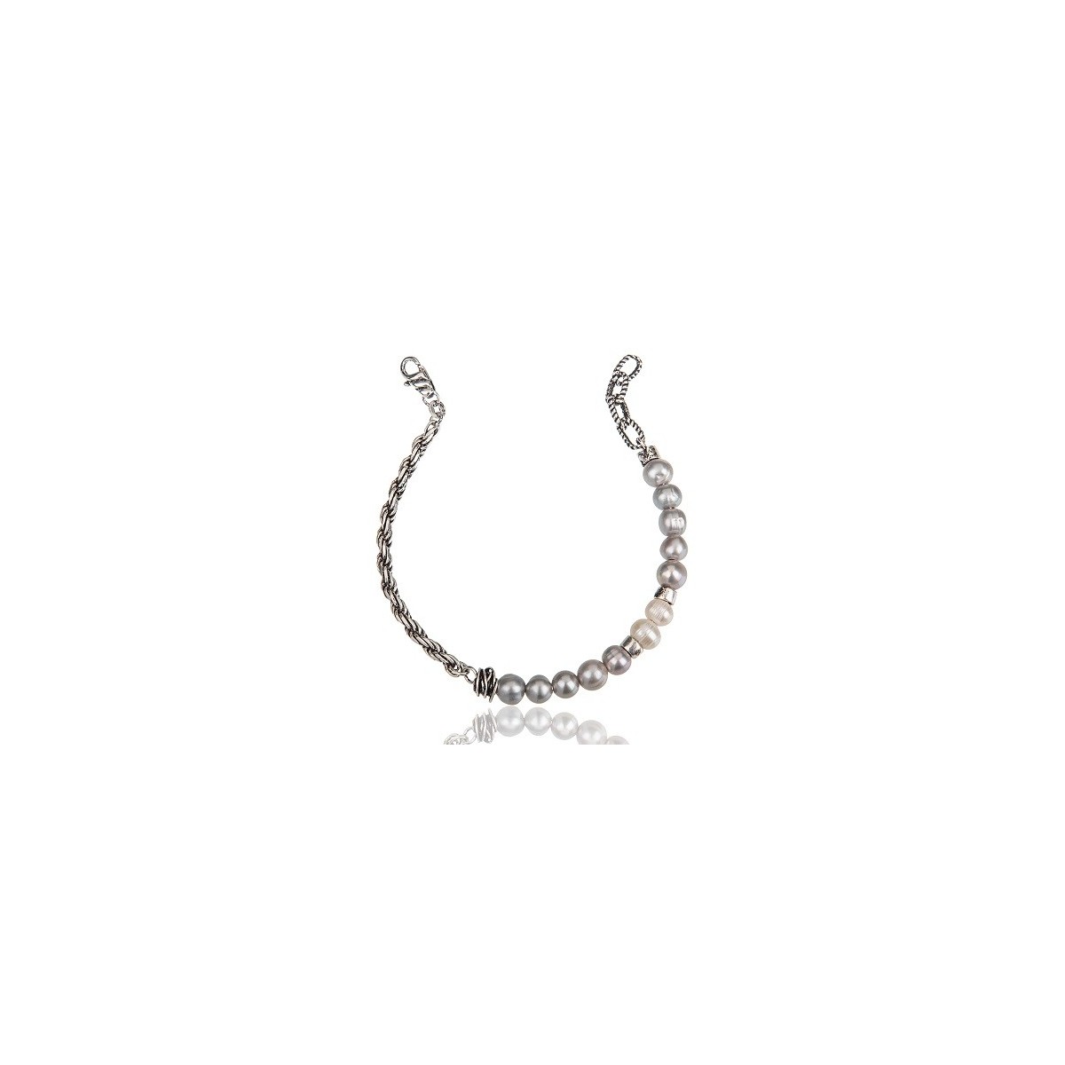 Bracciale da uomo Giacomo Burroni, appartenente alla collezione Indomitus, è realizzato interamente in argento 925/1000 brunito e perle d'acqua dolce di colore grigio e bianche. A dividere le due parti, un nodino di filigrana etrusca avvolta a mano. Chiusura regolabile.