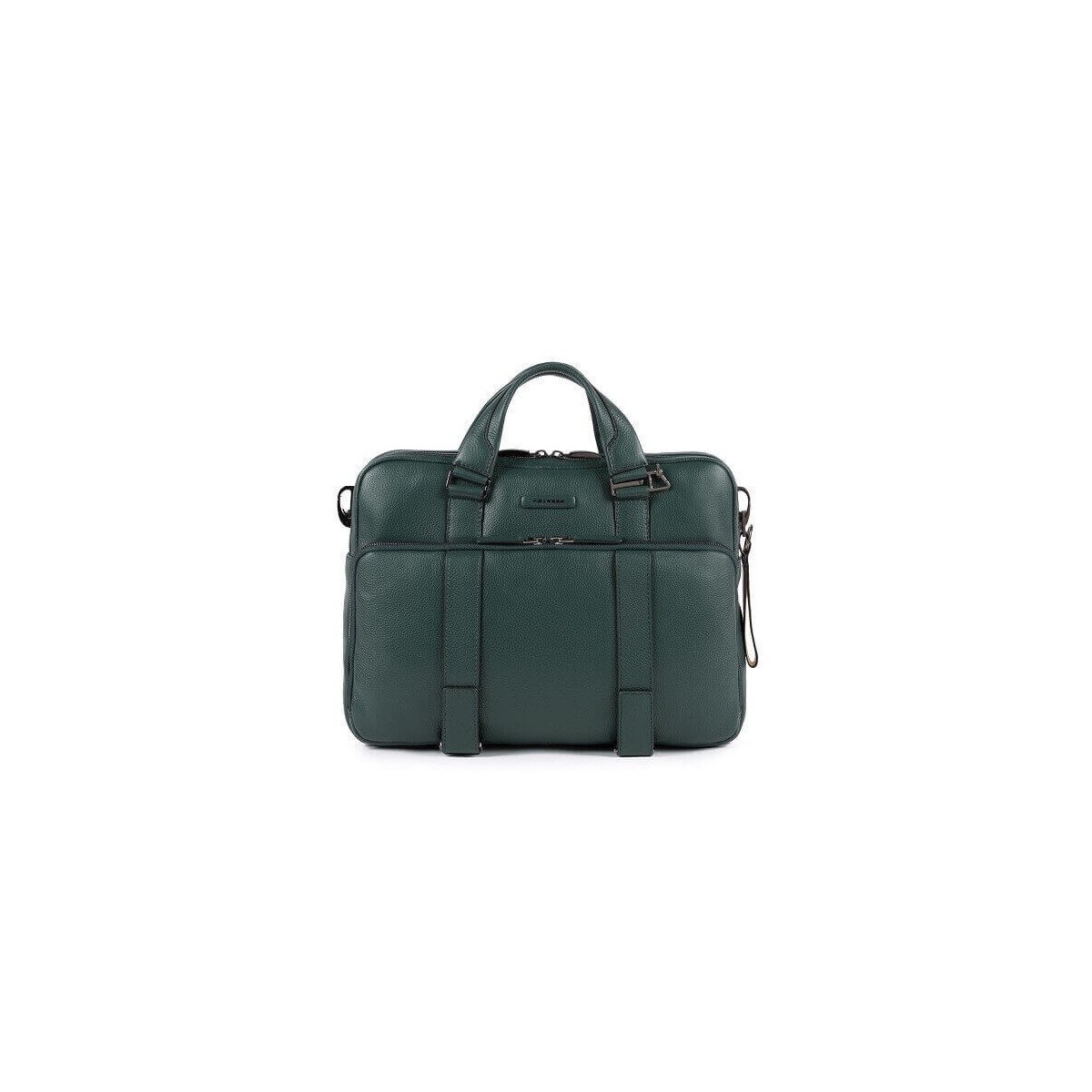 Cartella due manici porta pc/Ipad della collezione Modus, realizzata in vera pelle effetto martellato color verde, dotata di unico scomparto con cerniera, organizzato con vano notebook e Ipad, tasca frontale con cerniera, tracolla regolabile.