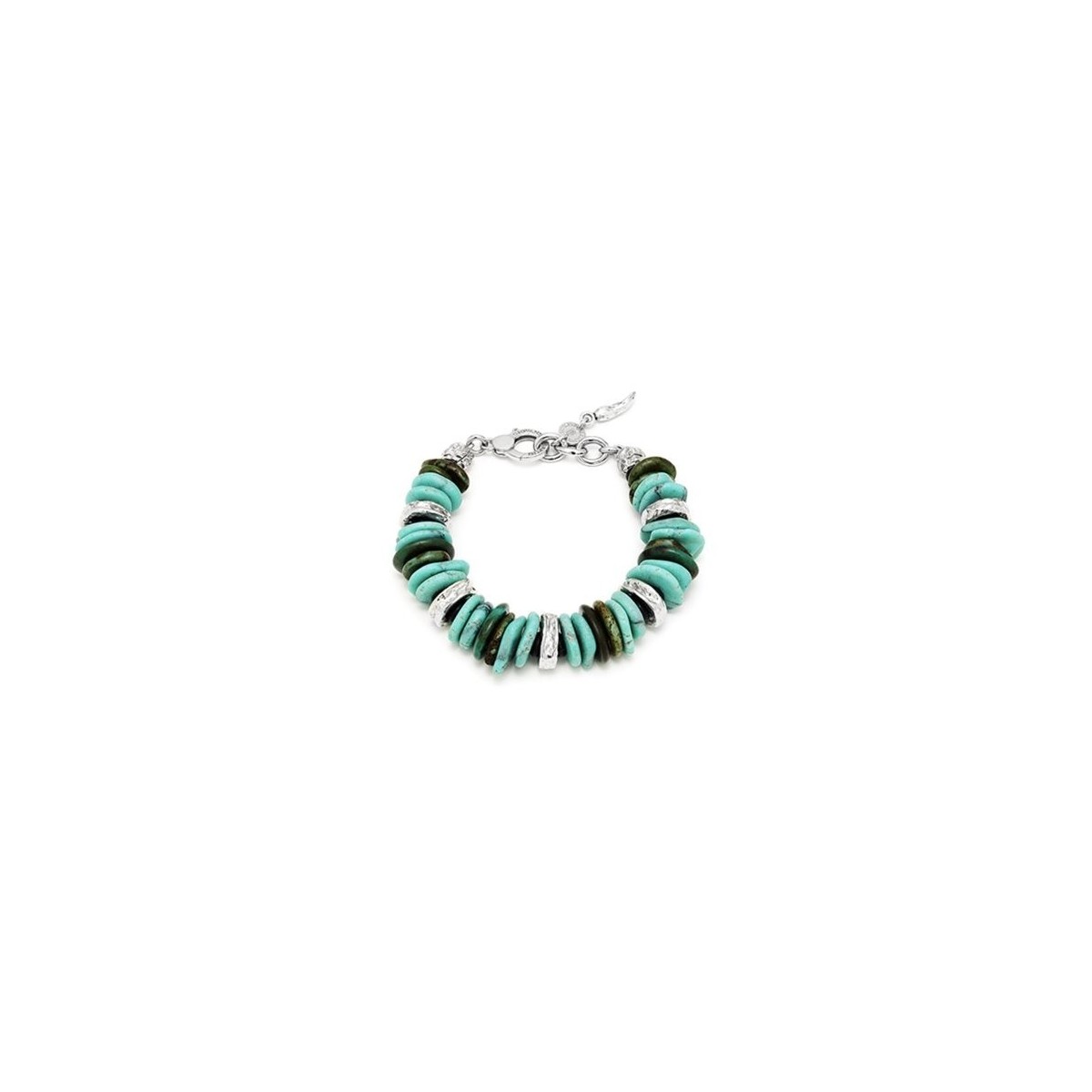 Bracciale femminile della collezione Bali blue ispirata all'estate mediterranea. Realizzato in prezioso argento 925 il bracciale è, inoltre, caratterizzato da pietre turchesi naturali e diaspro verde dal taglio grezzo poste ad intervallo. Chiusura a moschettone con maglie di regolazione, alla cui estremità troviamo un cornetto portafortuna in argento.