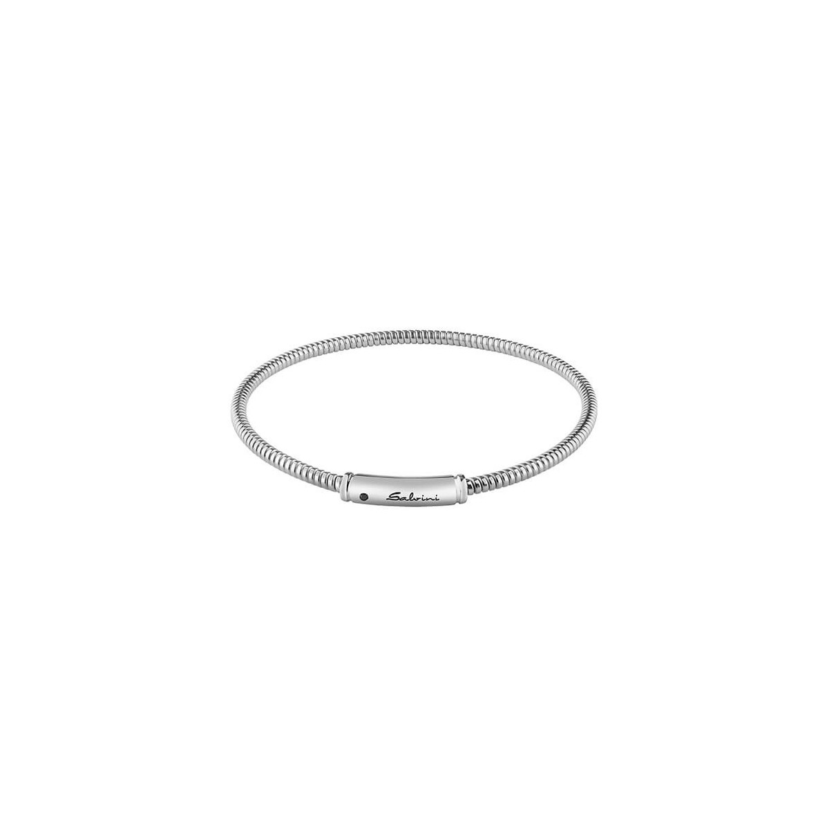 Bracciale da Uomo elastico Salvini, della collezione Minimal Pop, realizzato in oro bianco 9 carati e targhetta con logo impreziosita da piccolo diamante naturale taglio brillante di colore nero 0,018 carati.