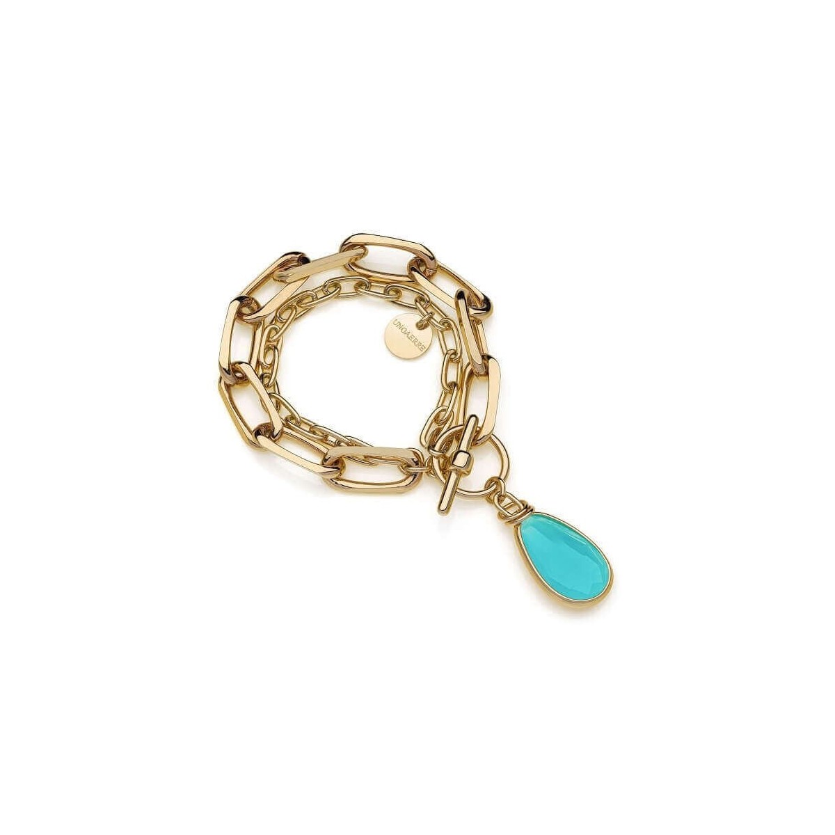 Bracciale femminile Unoaerre, collezione Classica, realizzato in bronzo lucido con bagno in oro giallo 24 carati. Bracciale composto da doppia catena forzatina allungata e pendente a goccia con cristallo turchese sfaccettato, che dona al gioiello un tocco glamour ed elegante, perfetto in ogni occasione. Chiusura gioiello T-bar.