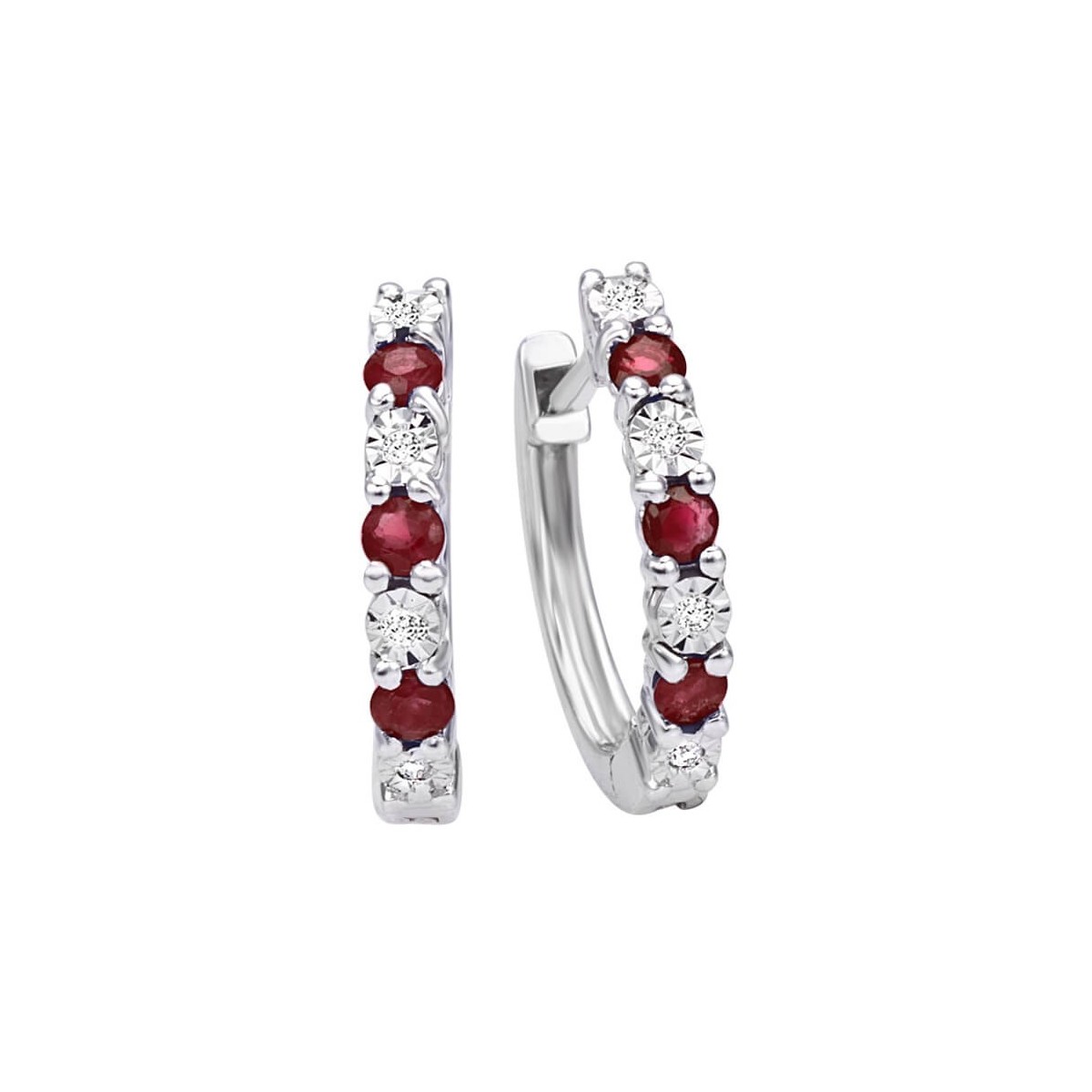 Orecchini a cerchio donna Bliss della collezione Jasmine realizzati in oro bianco 18 carati con 3 Rubini naturali per orecchino per un totale di 6 Rubini con caratura complessiva di 0,30 carati il tutto impreziosito da 8 diamanti naturali taglio brillante (4 per orecchino) con caratura complessiva da 0,03 carati.