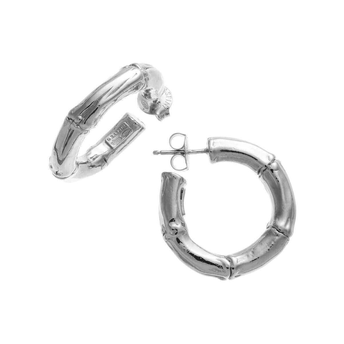 Orecchini a cerchio della collezione Bambù realizzati in argento 925 dal diametro di 3,4 cm. Gioiello leggero e pieno di luce, con chiusura a farfallina.