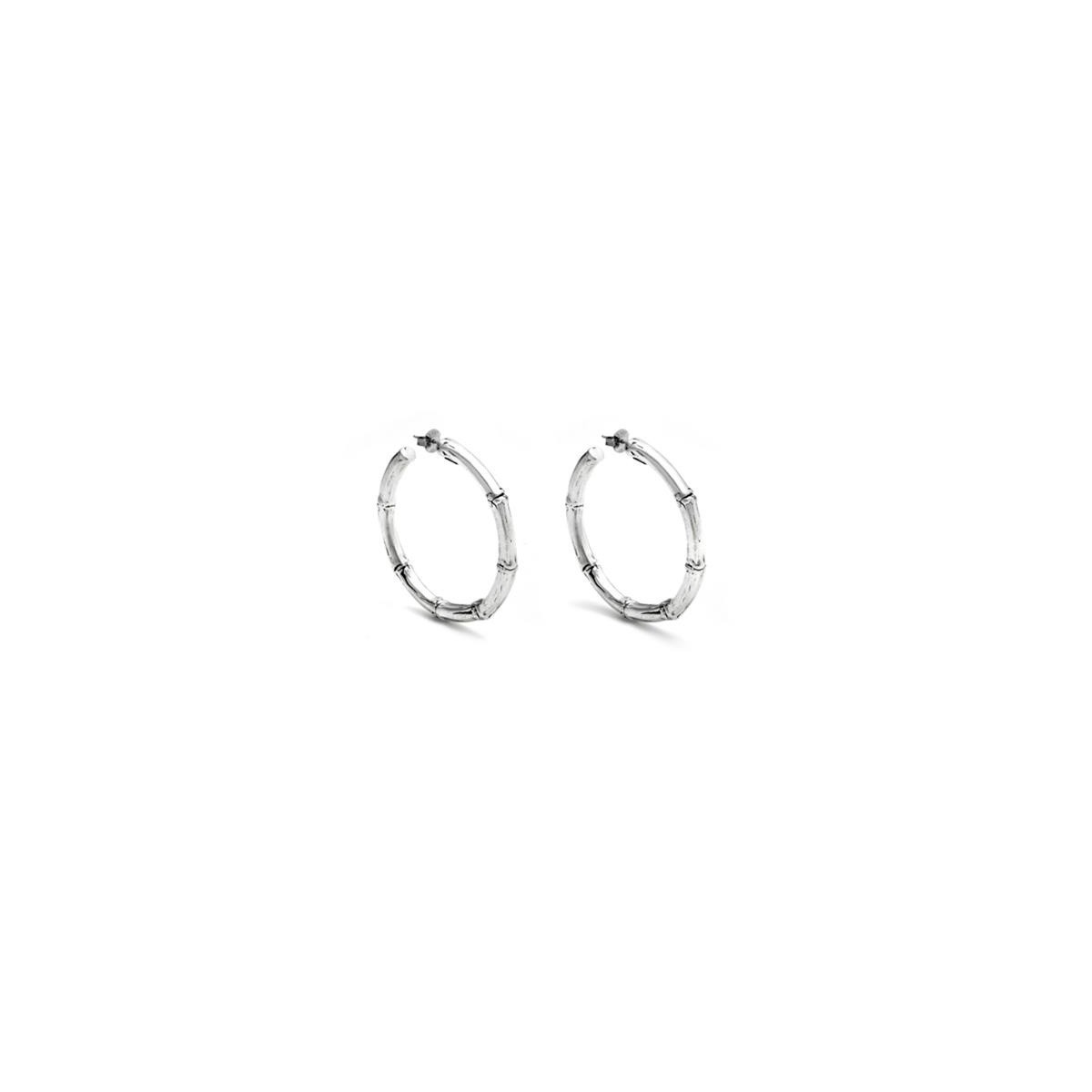 Orecchini a cerchio della collezione Bambù realizzati in argento 925 dal diametro di 5 cm. Gioiello leggero e pieno di luce, con chiusura a farfallina.