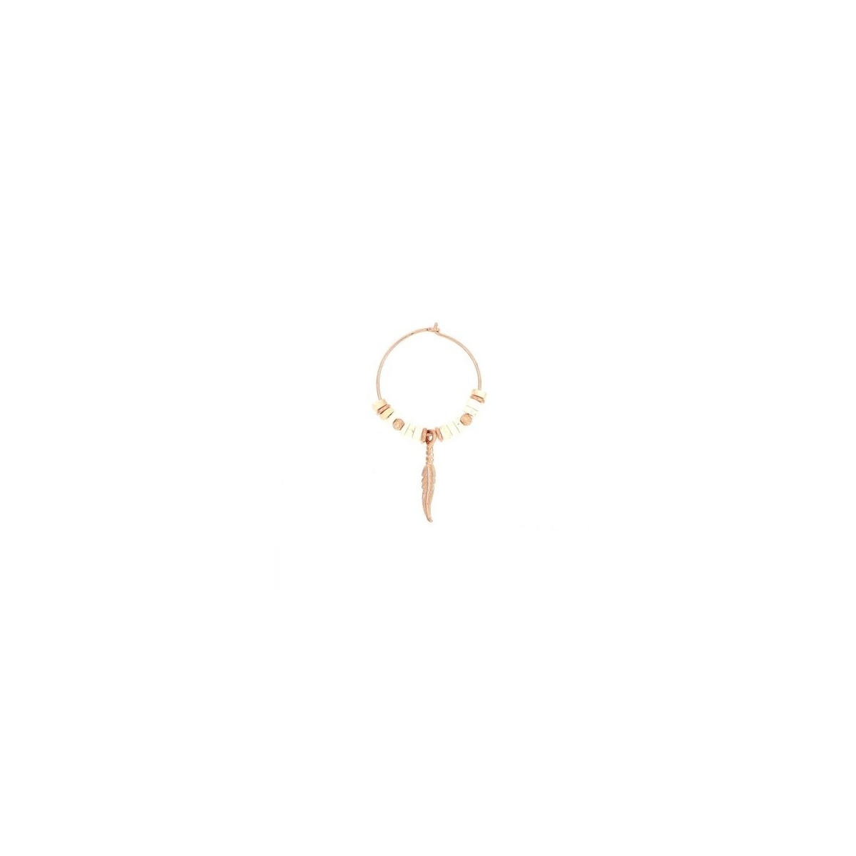 Orecchino singolo a cerchio da donna Maman et Sophie della collezione America 1492 realizzato in argento 925 placcato oro rosato. Caratterizzato da pietre di Aulite bianca, madreperla e piuma pendente lunga 23mm. Il diametro del cerchio è di 25mm mentre la lunghezza intera dell'orecchino è di 50mm.