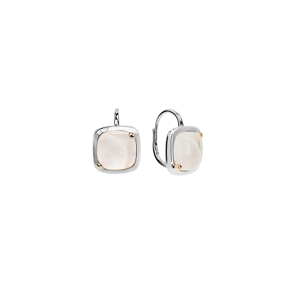 Orecchini a monachella da donna Mimì della collezione Dune realizzati in argento 925, con dettaglio di oro rosa 18 carati su due angoli della preziosa gemma: un quarzo rosa lavorato di 11x11 mm circa.