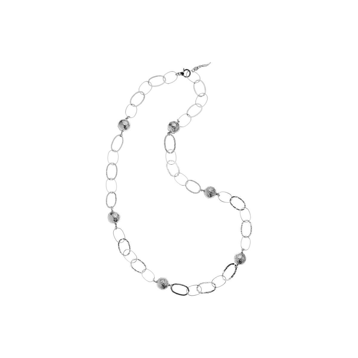 Collana femminile della collezione Catene ispirata ai legami infiniti di bellezza. Realizzato in prezioso argento 925 la collana è realizzata a mano e caratterizzata da catena lunga a maglie larghe intervallata da sfere in argento con motivo martellato. Chiusura a moschettone alla cui estremità troviamo un cornetto portafortuna in argento.