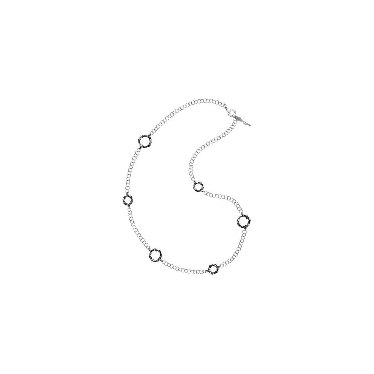 Collana lunga 88 m, della collezione Millefiori, realizzata in argento 925, modello chanel alterna una catena a maglia tonda con elementi circolari realizzati in fusione, qui la luce si manifesta mediante la tecnica della diamantatura, che conferisce ai minuscoli petali in argento un effetto scintillante, in contrasto con la catena e la base brunita. Chiusura a moschettone con maglie di regolazione.