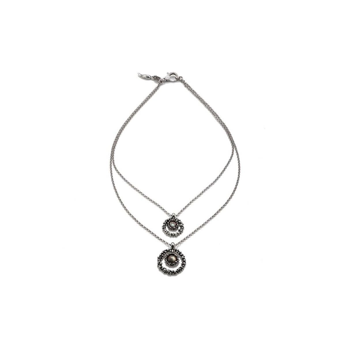 Collana femminile della collezione Mini Maui ispirata all'omonima isola delle Hawaii. Realizzato in prezioso argento 925 la collana è caratterizzata da doppia catena e coppia di pendenti resi unici dalla presenza di madreperla e quarzo nelle sfumature del grigio, rosa e verde che ci regalano i colori dell'alba. Chiusura a moschettone alla cui estremità troviamo un cornetto portafortuna in argento.