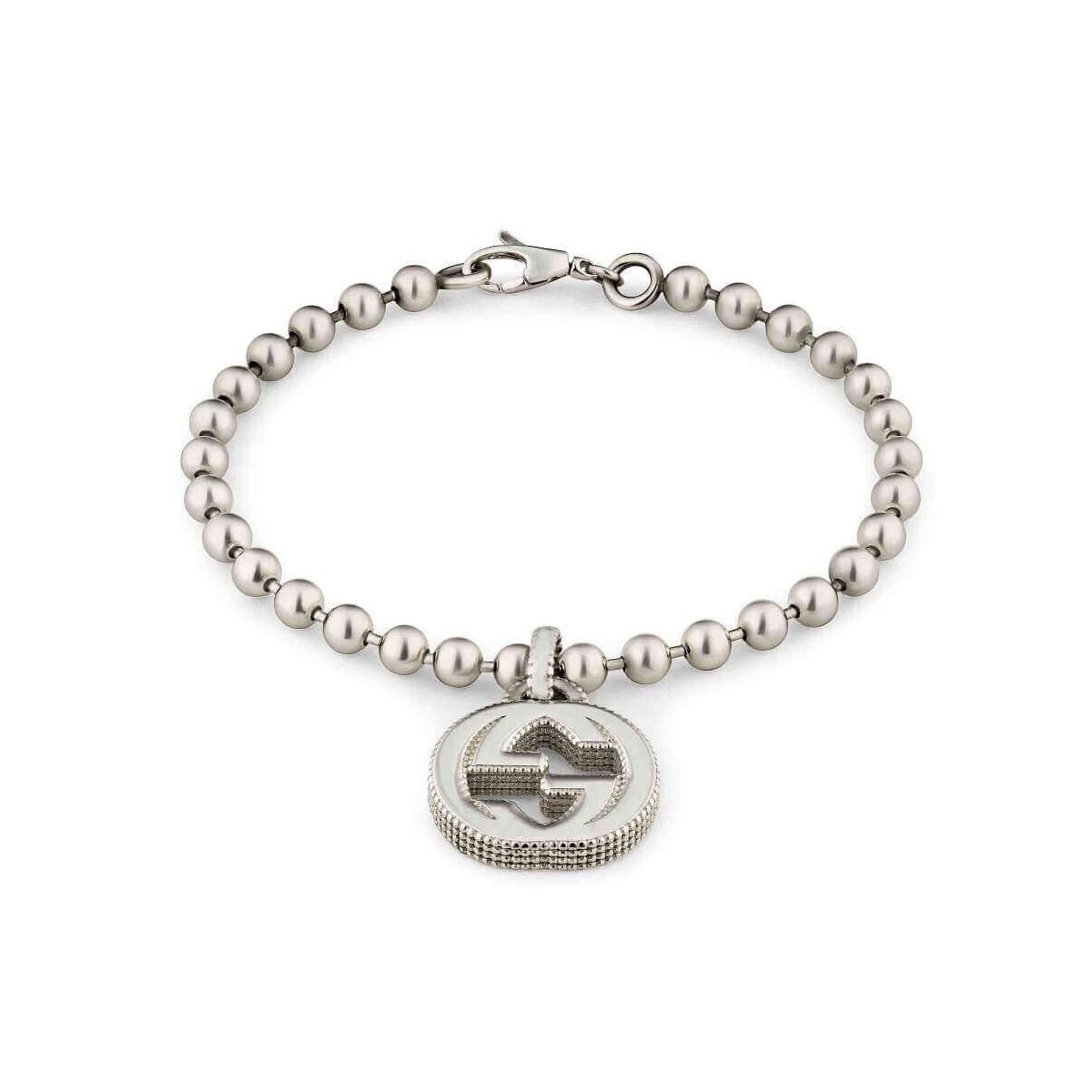 Bracciale da donna della collezione Interlocking realizzato in argento sterling 925 con catena formata da piccole boule e charms pendente con logo doppia G, motivo interlocking ed elegante bordo in grana. Misura 17cm e chiusura a moschettone.