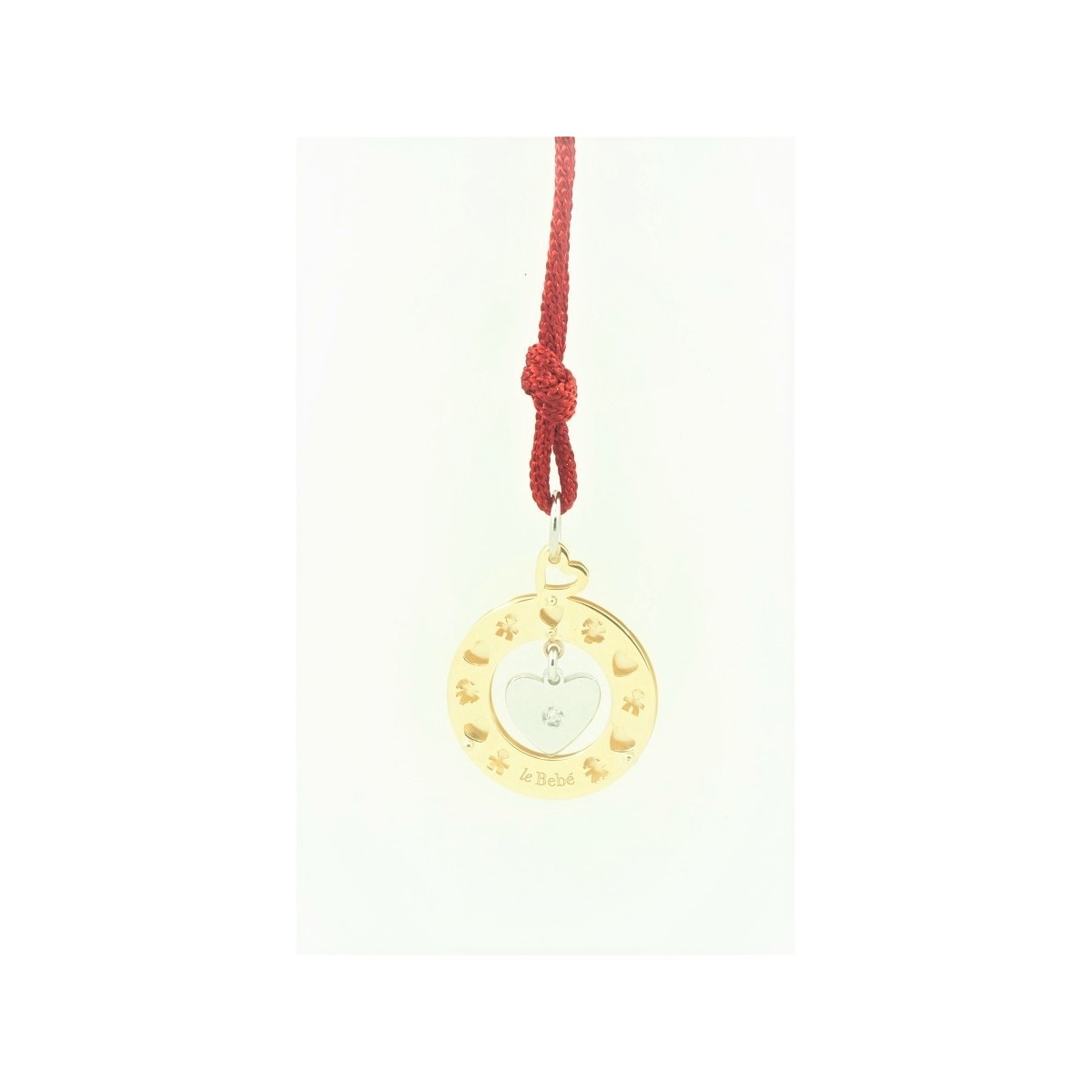 Collana in cordino rosso con pendente circolare e cuore in oro 9kt giallo e bianco della collezione Le Bebè Festa della Mamma 2017 con diamante taglio brillante.