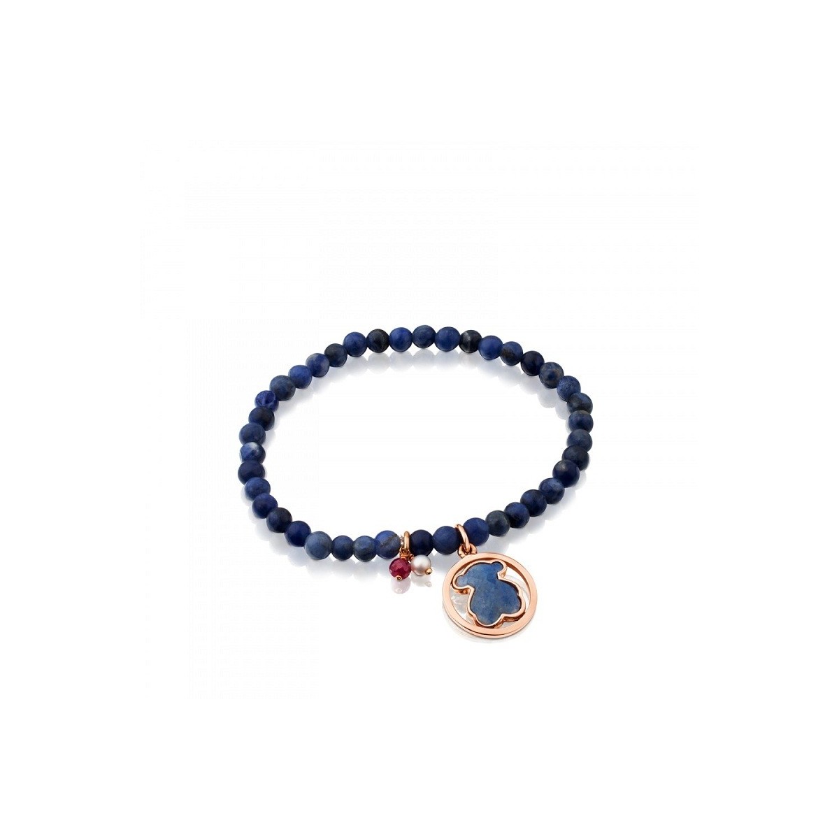 Bracciale elastico con pietre di dumortierite, iolite e perle con pendente a forma di orsetto in dumortierite in una struttura in argento vermeil placcato oro rosa 18 kt - 712161680