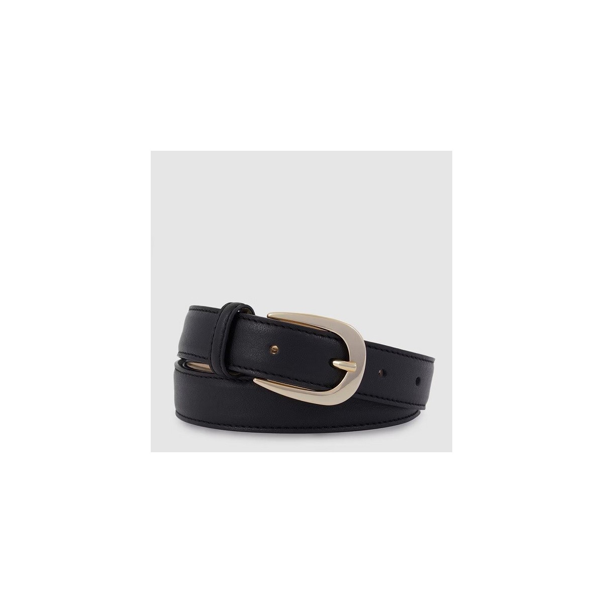 Cintura donna, linea Circle, realizzata in pelle di colore nero con chiusura a fibbia color oro ad ardiglione.