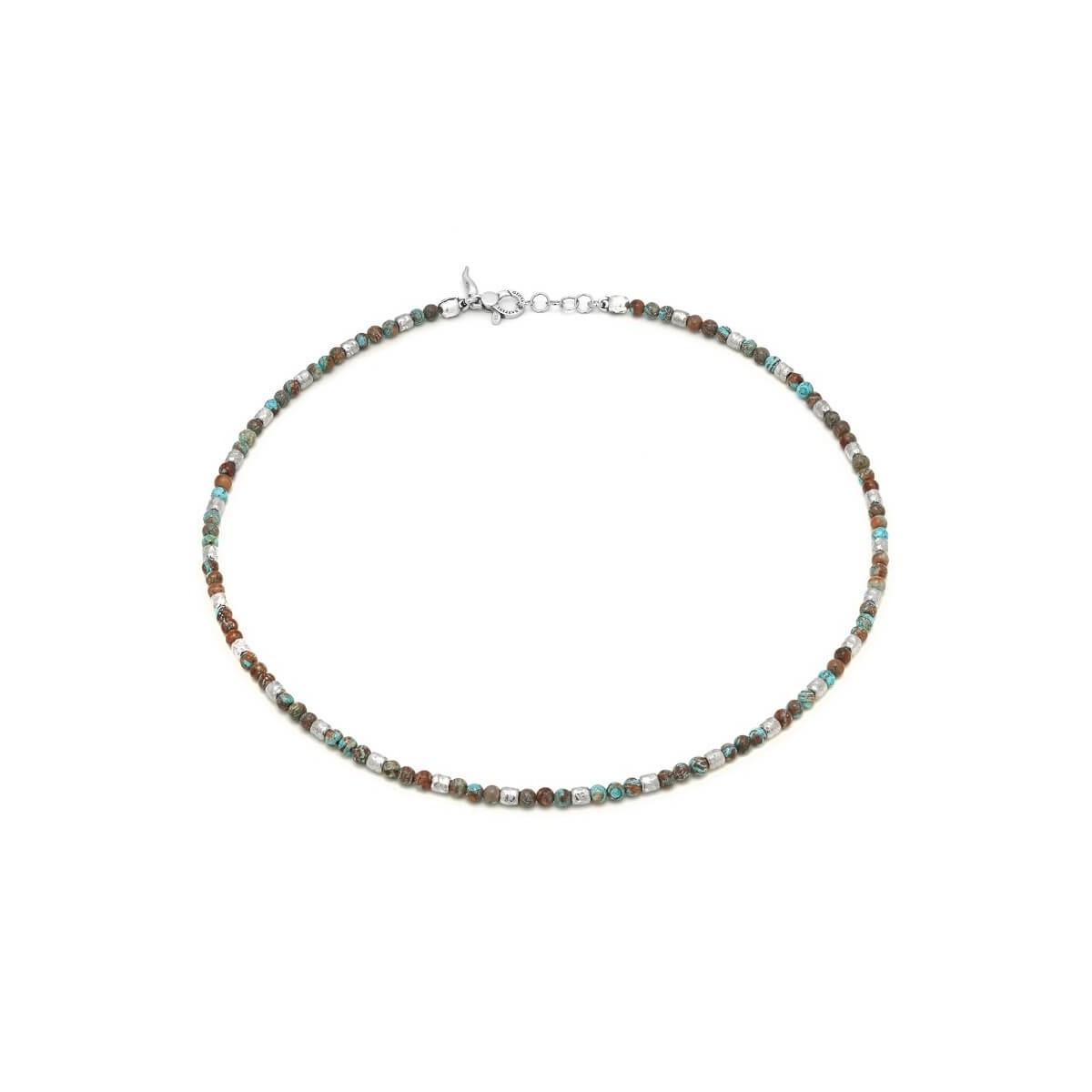 Collana maschile Tango Giovanni Raspini, realizzata ad alternanza con piccoli elementi in argento 925 e sferette in agata multicolor ispirata ai colori freschi della natura, lunga 50cm con chiusura a moschettone con maglie di regolazione.